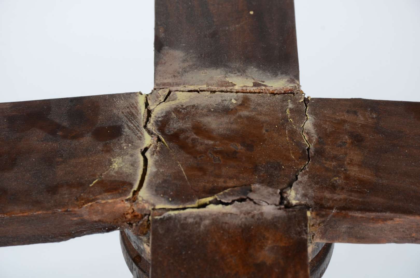 Mesa auxiliar de madeira ebanizada, estilo oriental, tampo redondo, saia com hastes arredondadas e vazadas, quatro pe...
