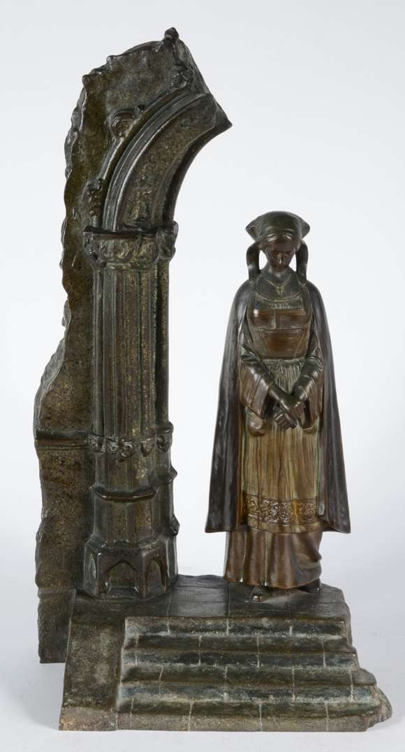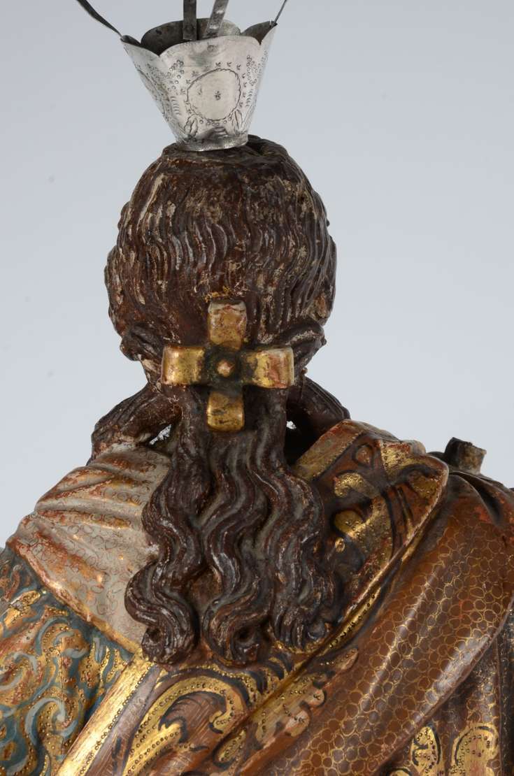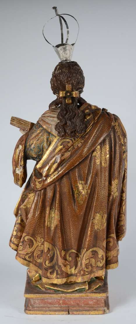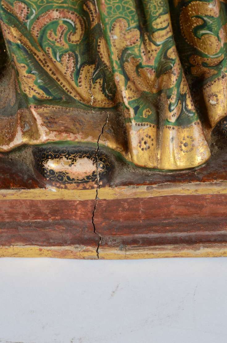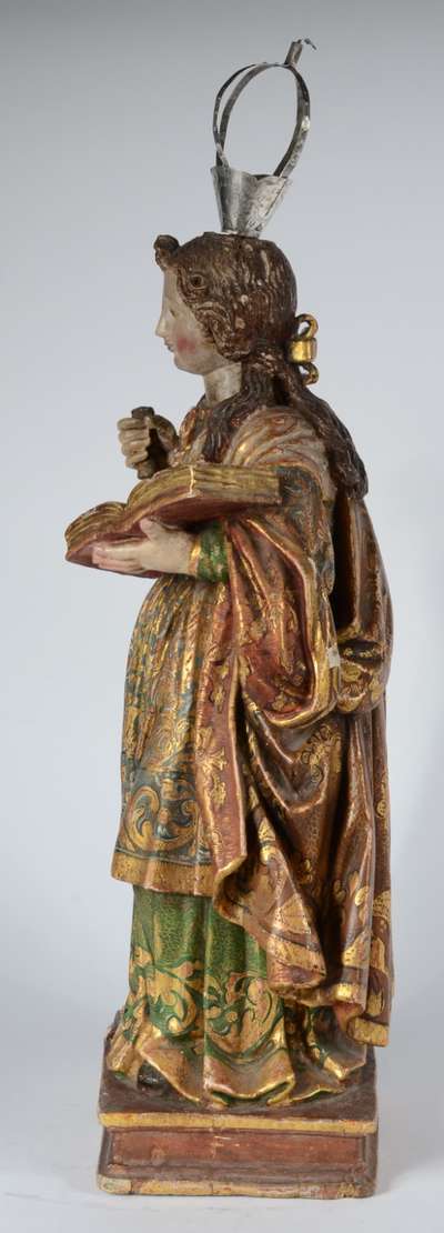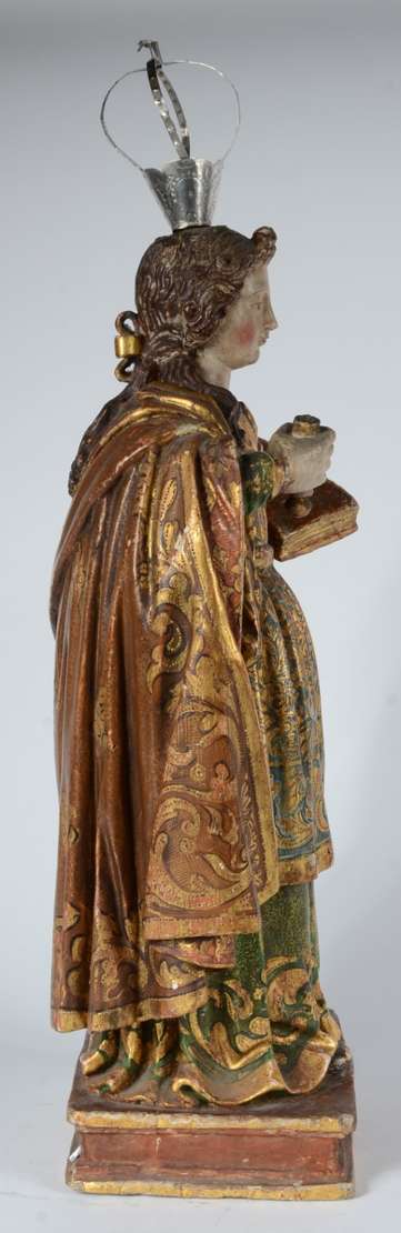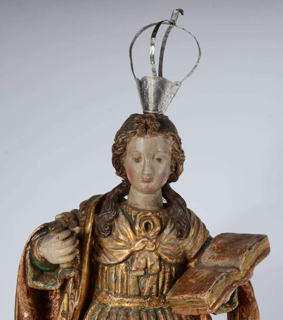 Santa Quitéria - Excepcional Imagem de madeira policromada e dourada, Portugal. Século XVIII. Escultura em madeira com movimentos graciosos, dando a sensação de que os tecidos balançam de um lado para o outro. Pregueado do vestido de vincos alongados e profundos. Sua cabeça é altiva e o penteado elaborado, com grandes mechas repuxadas para trás. O manto esvoaçante amplia sua volumetria, e caprichosamente a cintura fina lhe dá um ar de elegância e feminilidade. Coleção Ernane Galvêas.