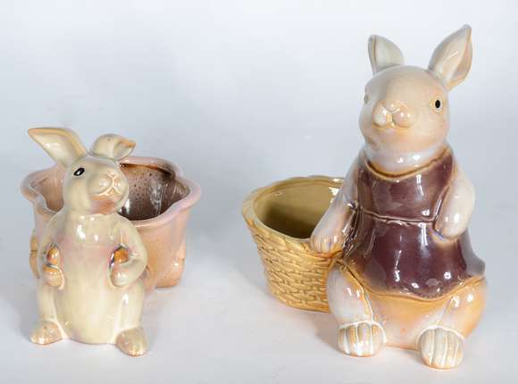 Duas esculturas de porcelana policromada representando coelhos com cestos.
