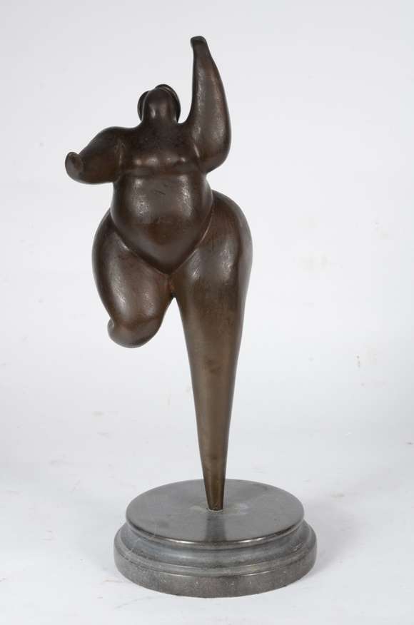Buda da fertilidade de porcelana policromada, base de madeira.