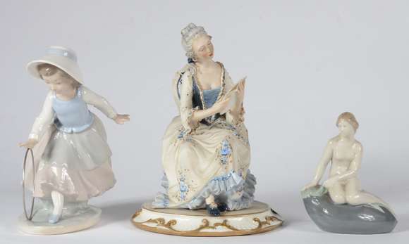 Três estatuetas diversas de porcelana, sendo uma italiana representando figura feminina "La Traviata", menina com bam...