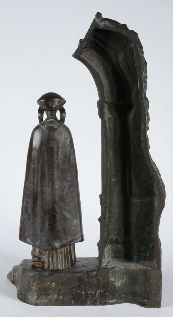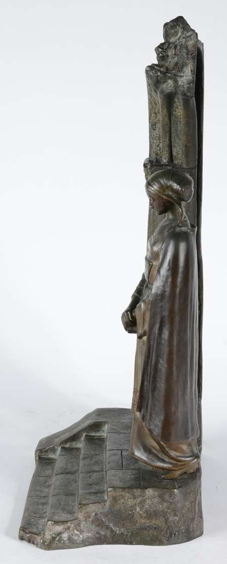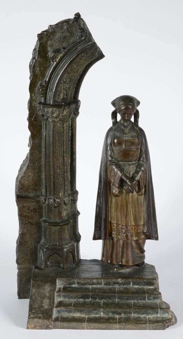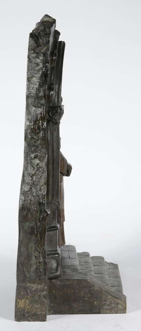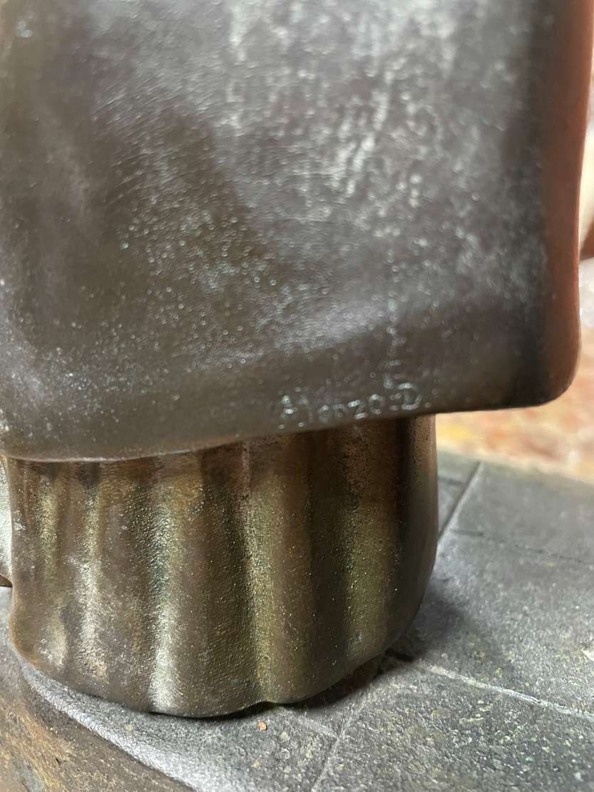 Estatueta de bronze e marfim representando Joana D'arc. Assinada. (possivelmente um sinete)