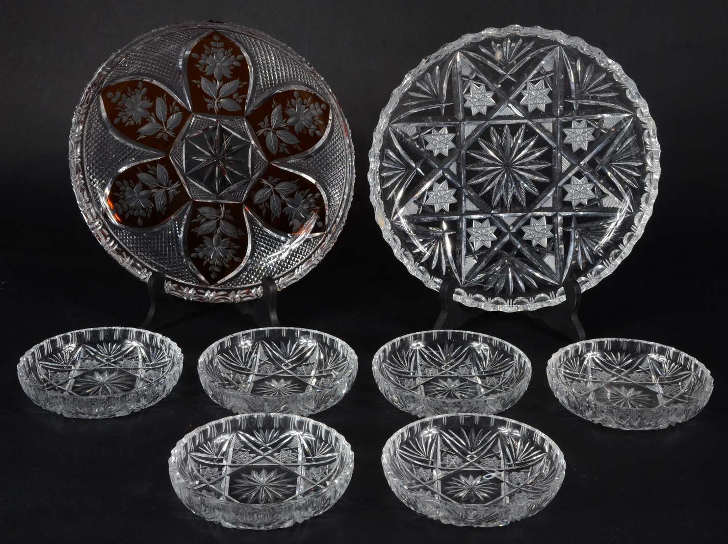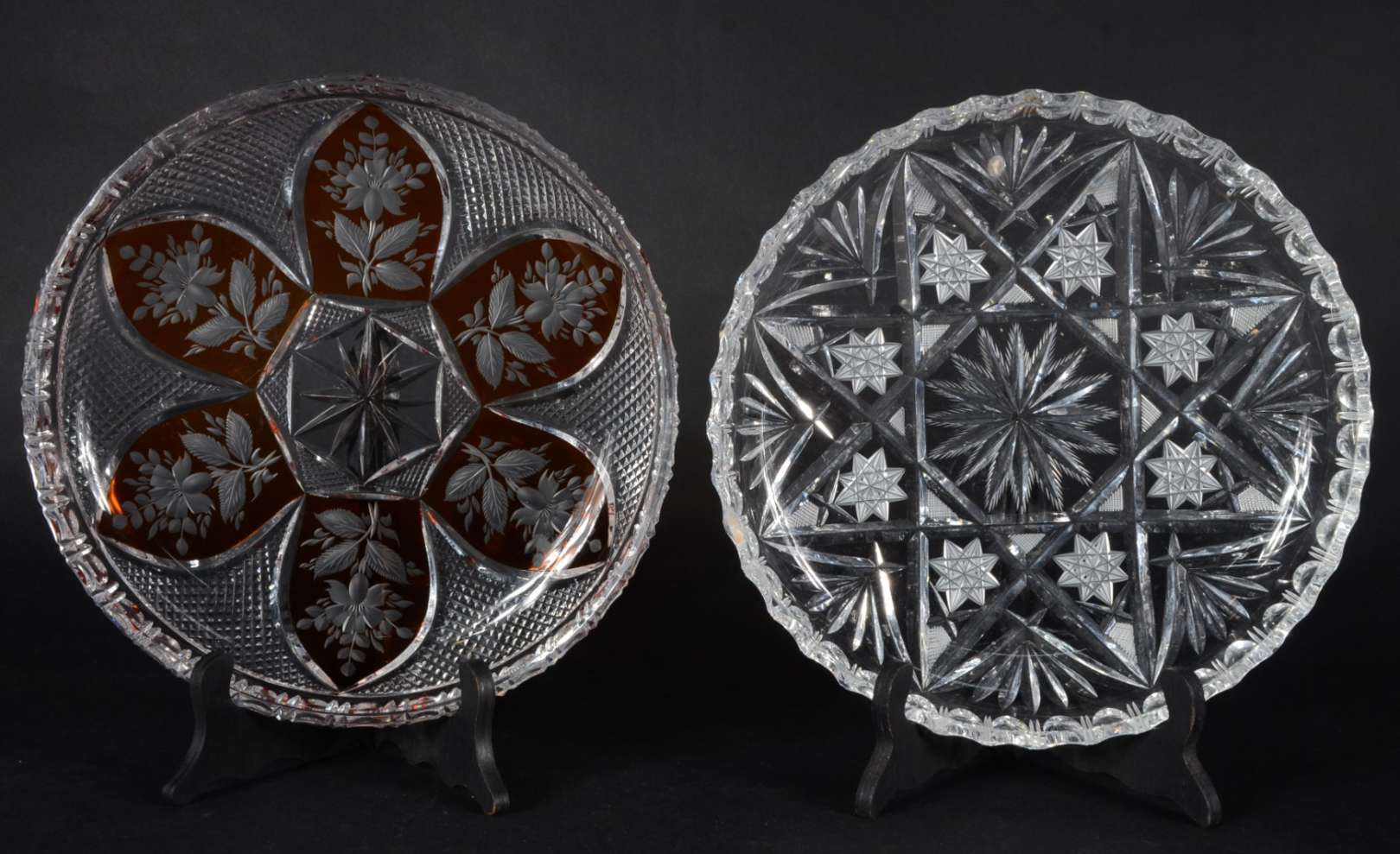 Três peças diversas de vidro trabalhado, sendo: 2 porta confeitos e travessa.