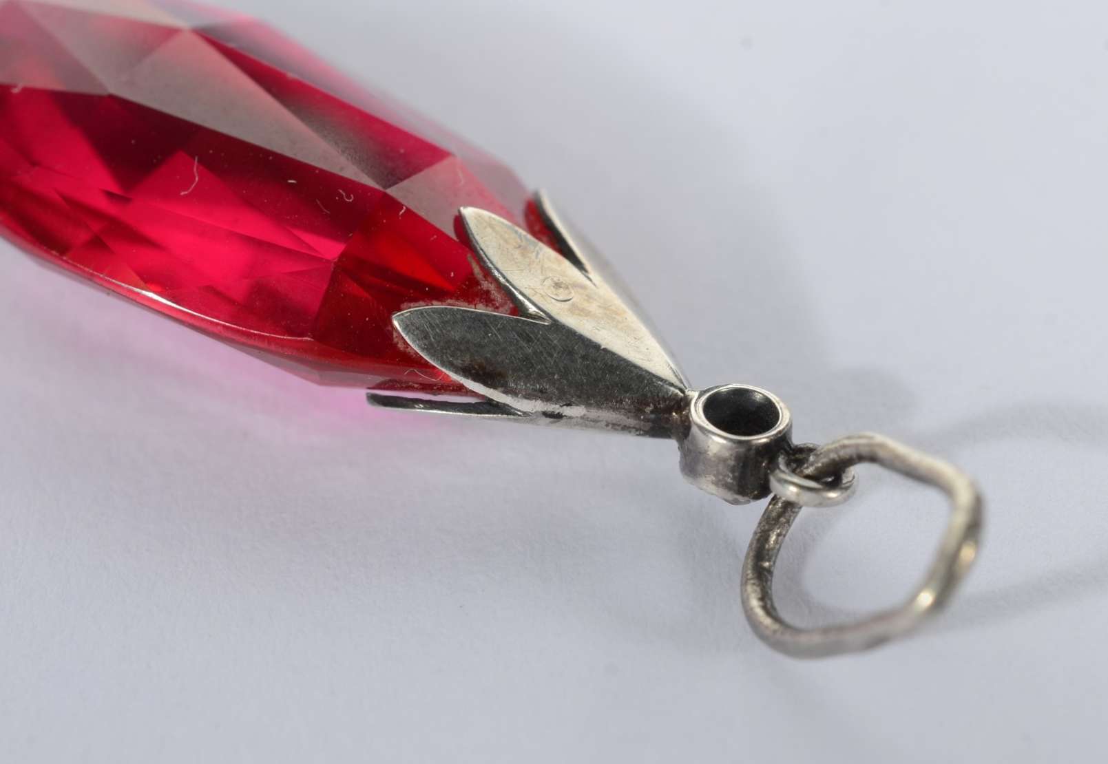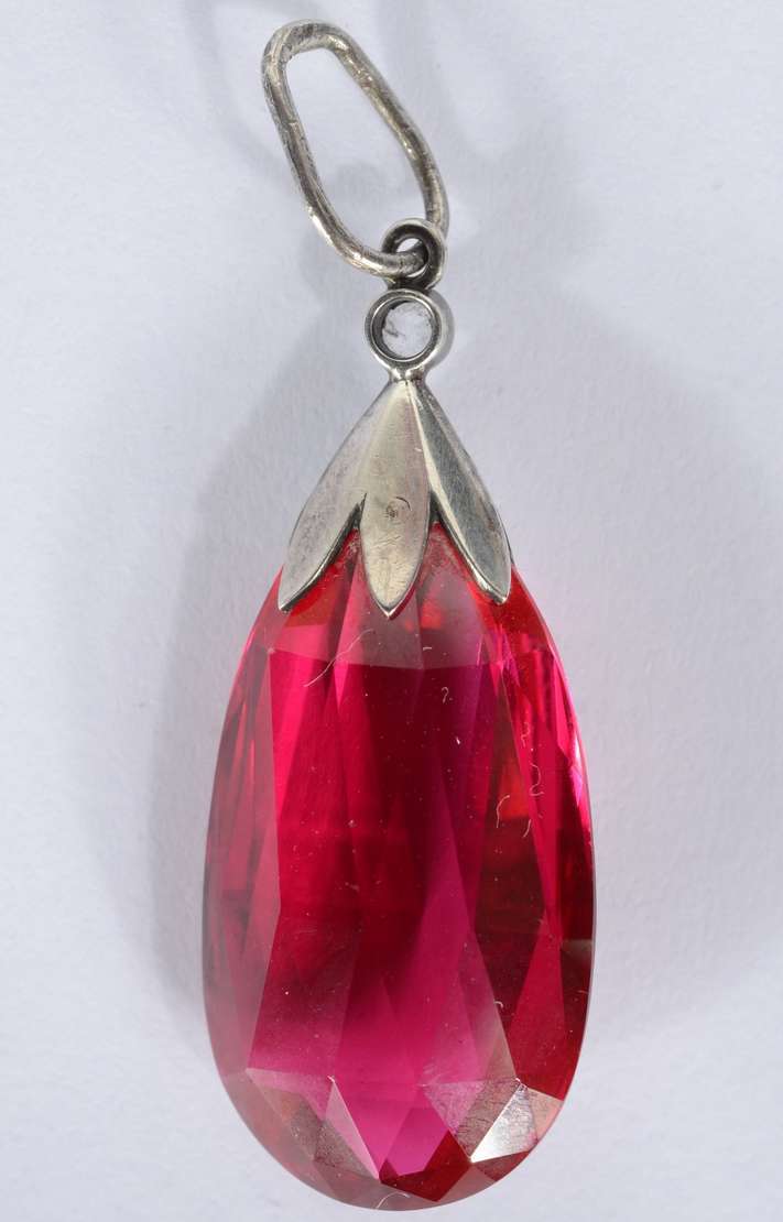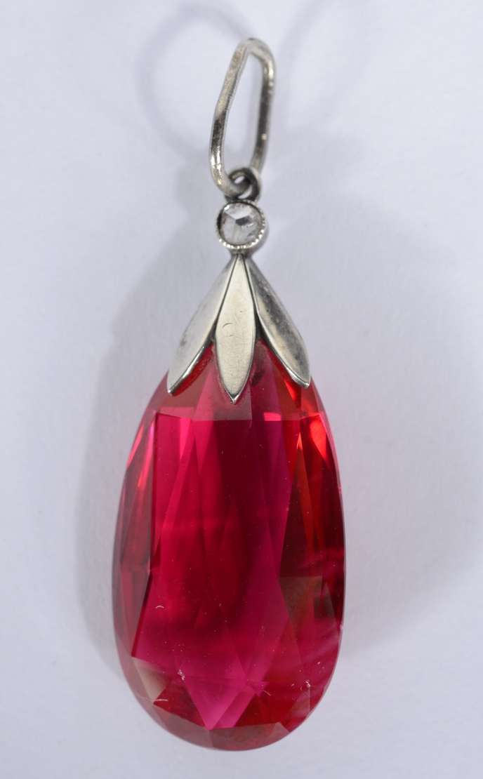 Anel de ouro 18 k., três brilhantes em cada lado e pedra central oval na cor vermelha. Aro 16. (Por motivos de segura...