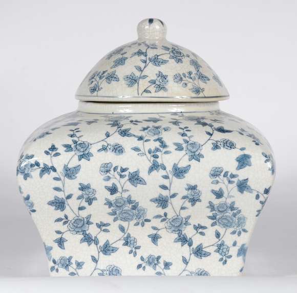 Grande ânfora com alças de cerâmica portuguesa pintada a mão com motivos florais em policromia sobre fundo azul cobal...