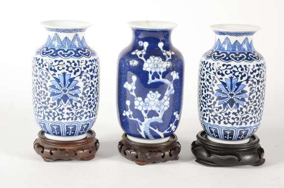 Três vasos de porcelana oriental azul e branco, bases de madeira.