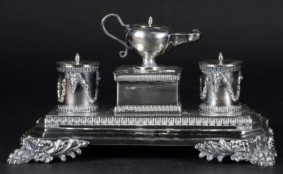 Exuberante tinteiro de mesa em prata inglesa victoriana repuxada e cinzelada, de formato retilíneo chanfrado, ornado ...