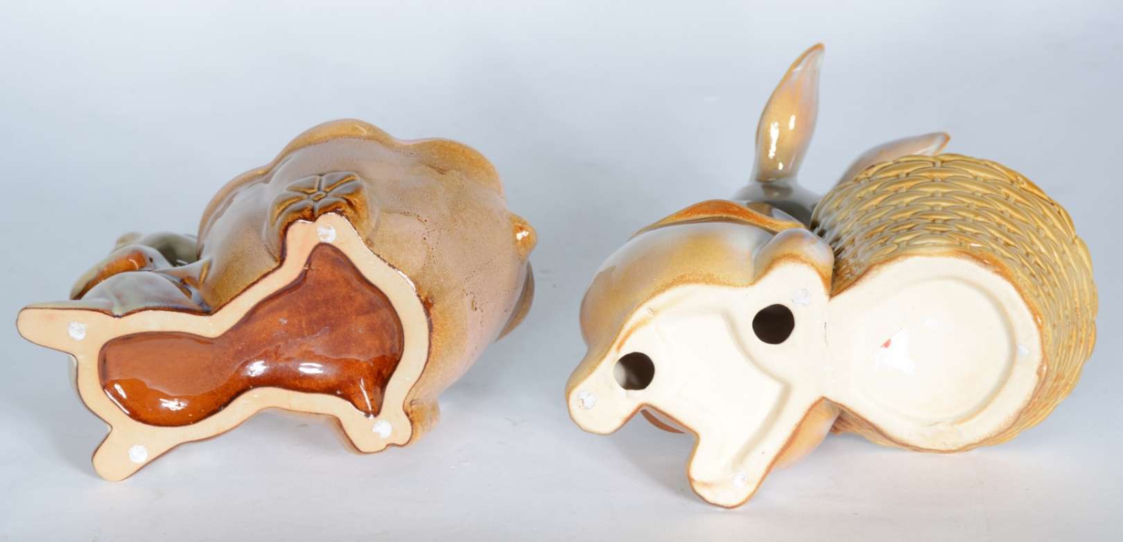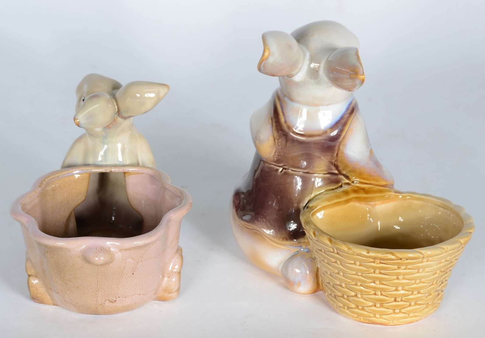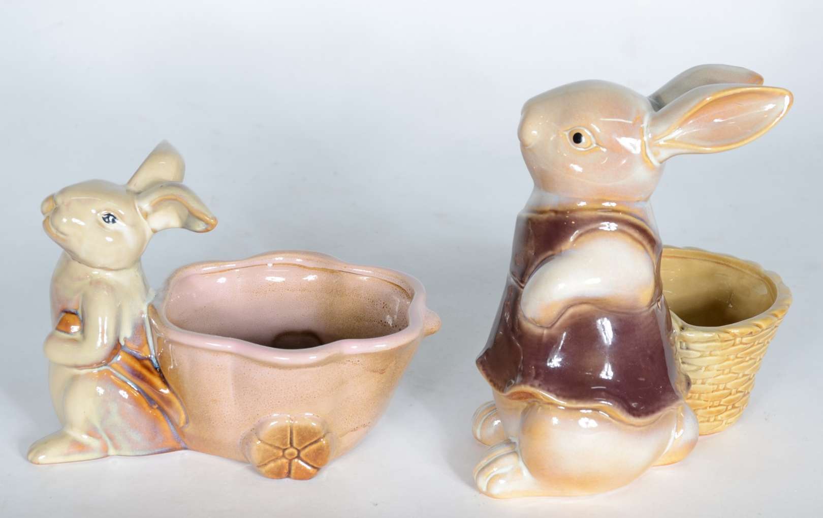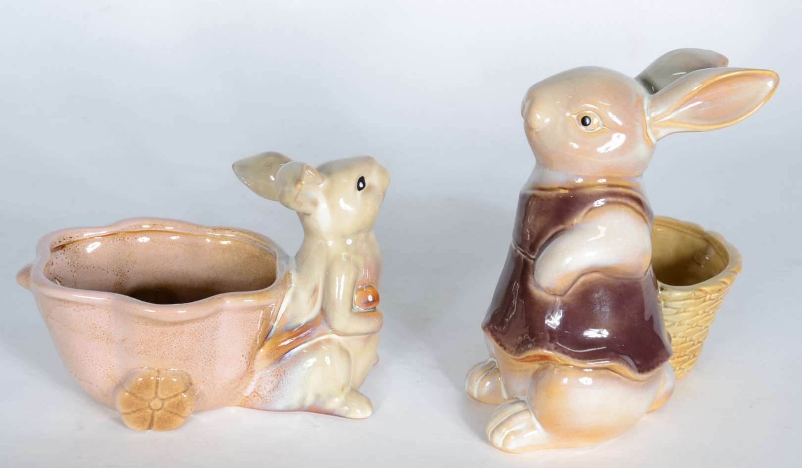 Duas esculturas de porcelana policromada representando coelhos com cestos.