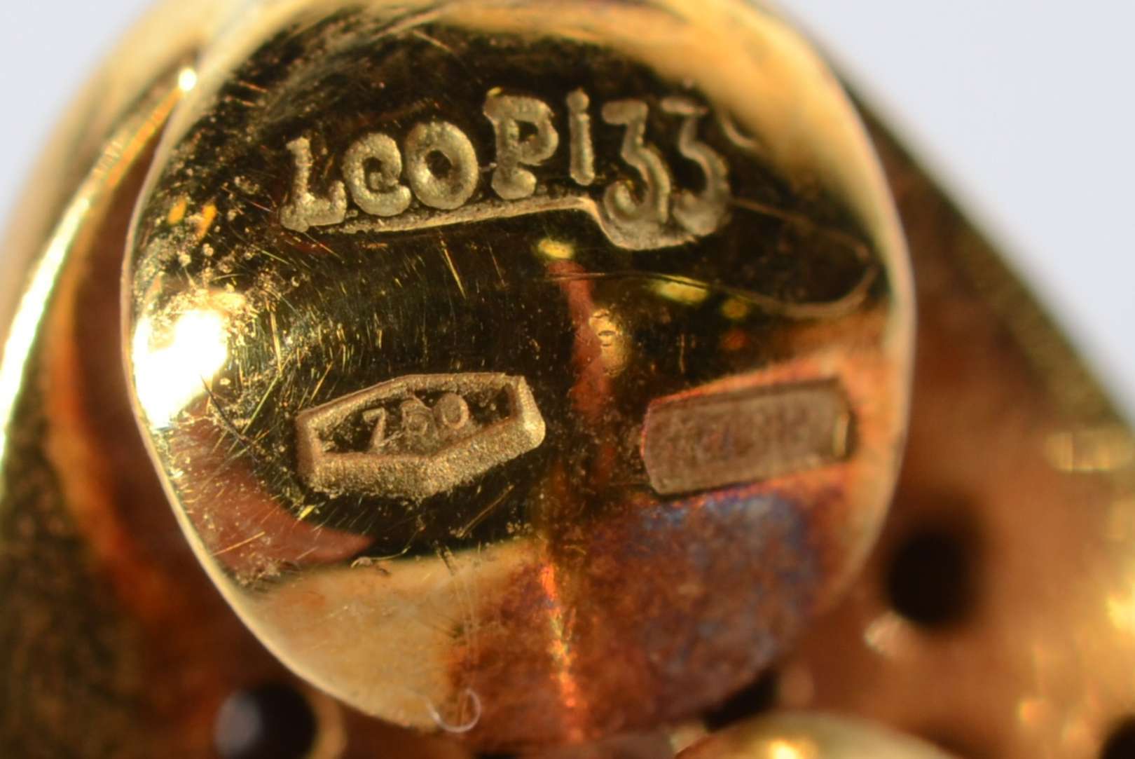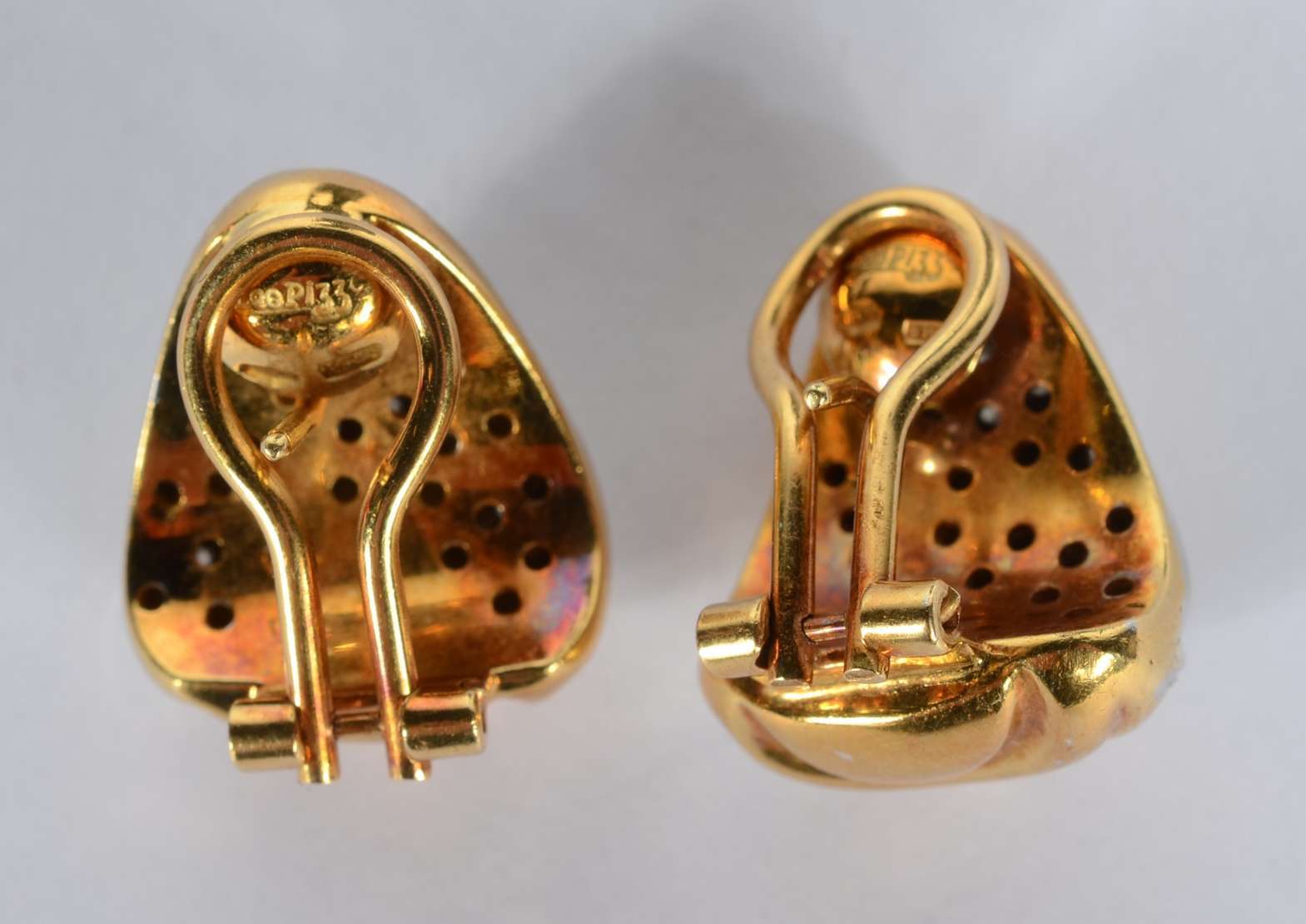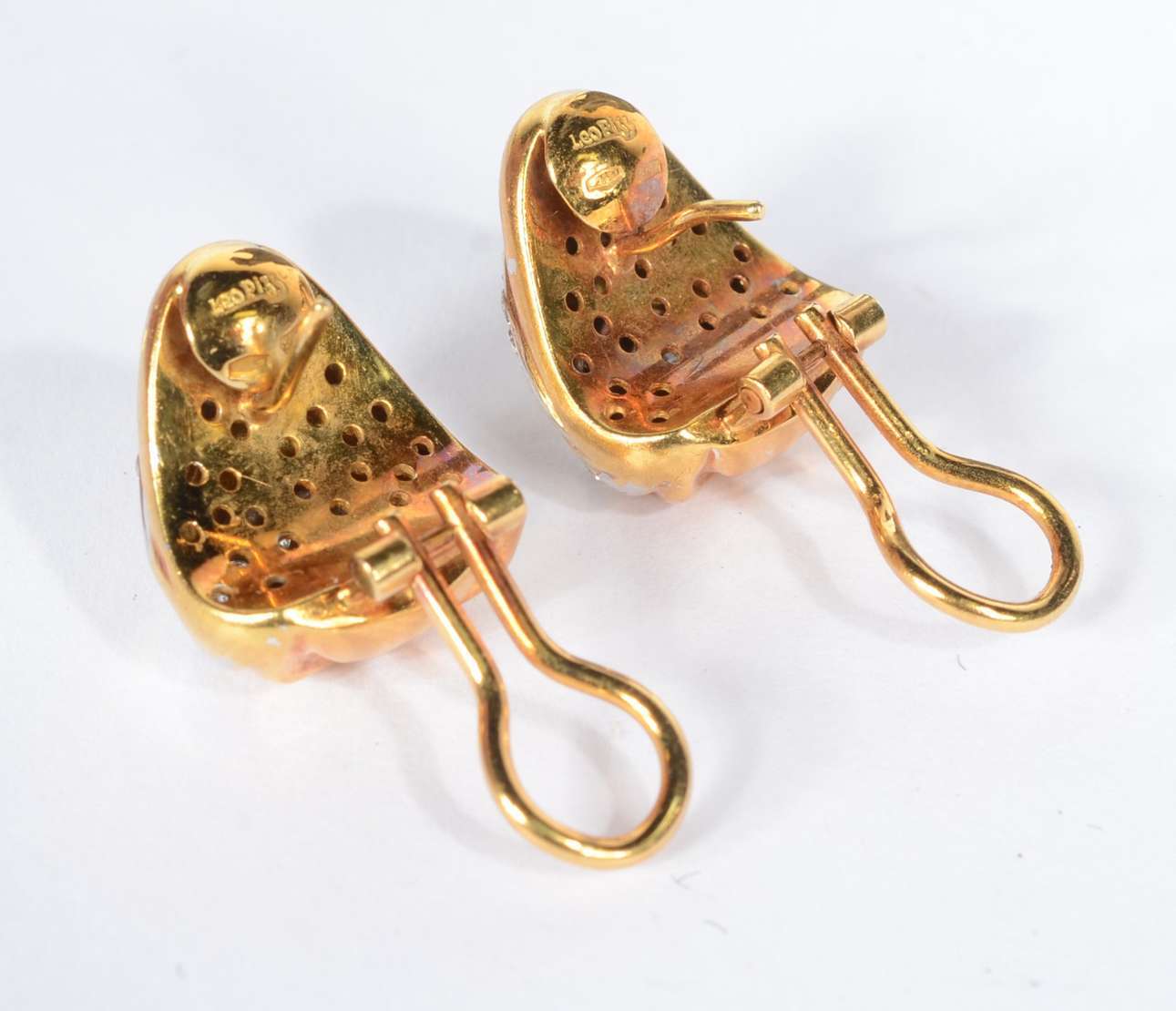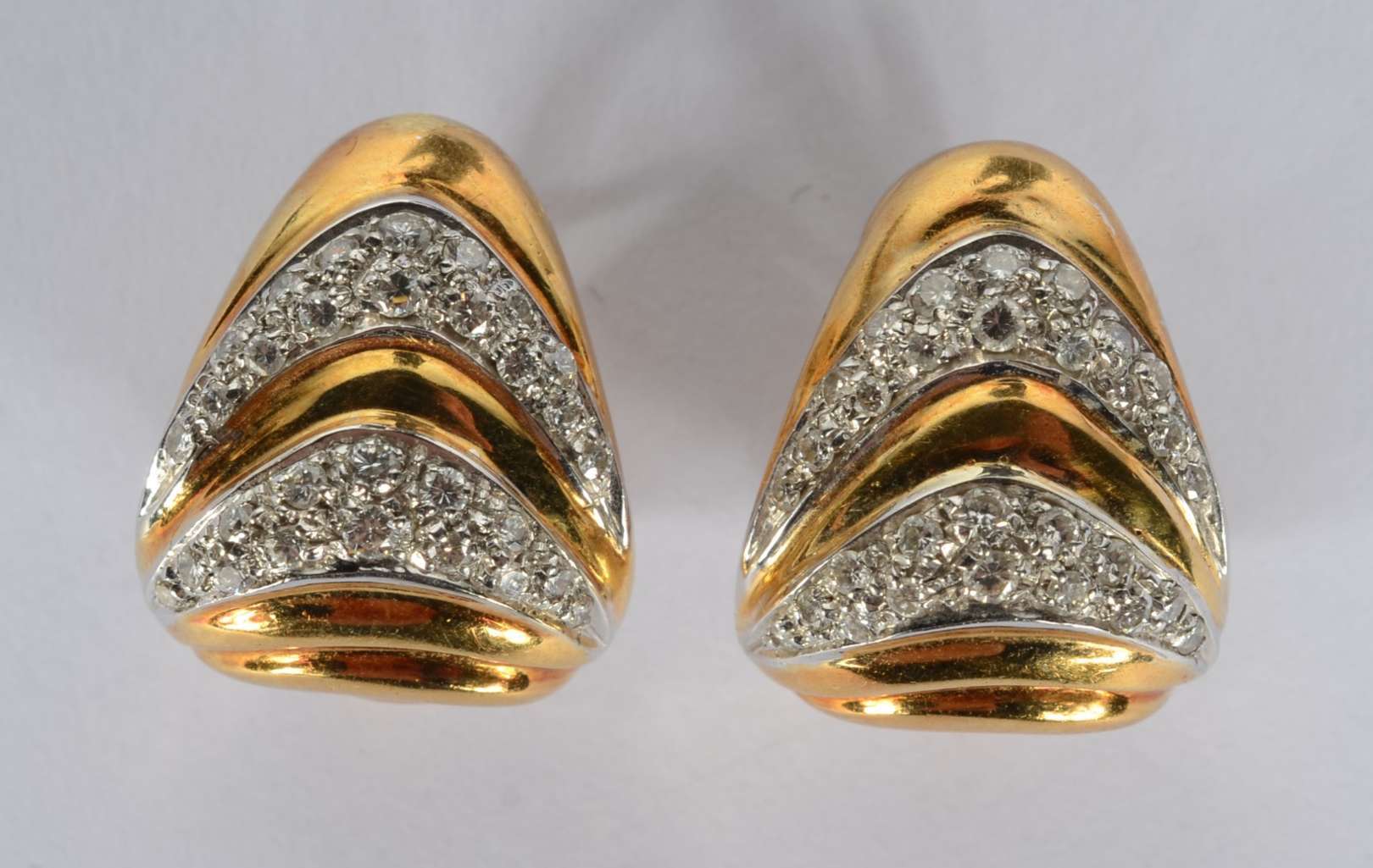 Par de brincos com duas "argolas" de ouro 18 k., com brilhantes. (Por motivos de segurança a peça não se encontra na...