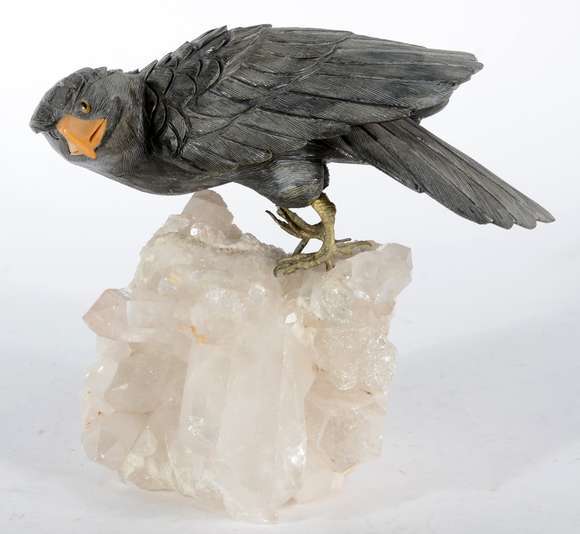 Pássaro de pedra sobre bloco de cristal bruto. (Furos do encaixe da pedra diferentes dos que tem nas patas da ave).