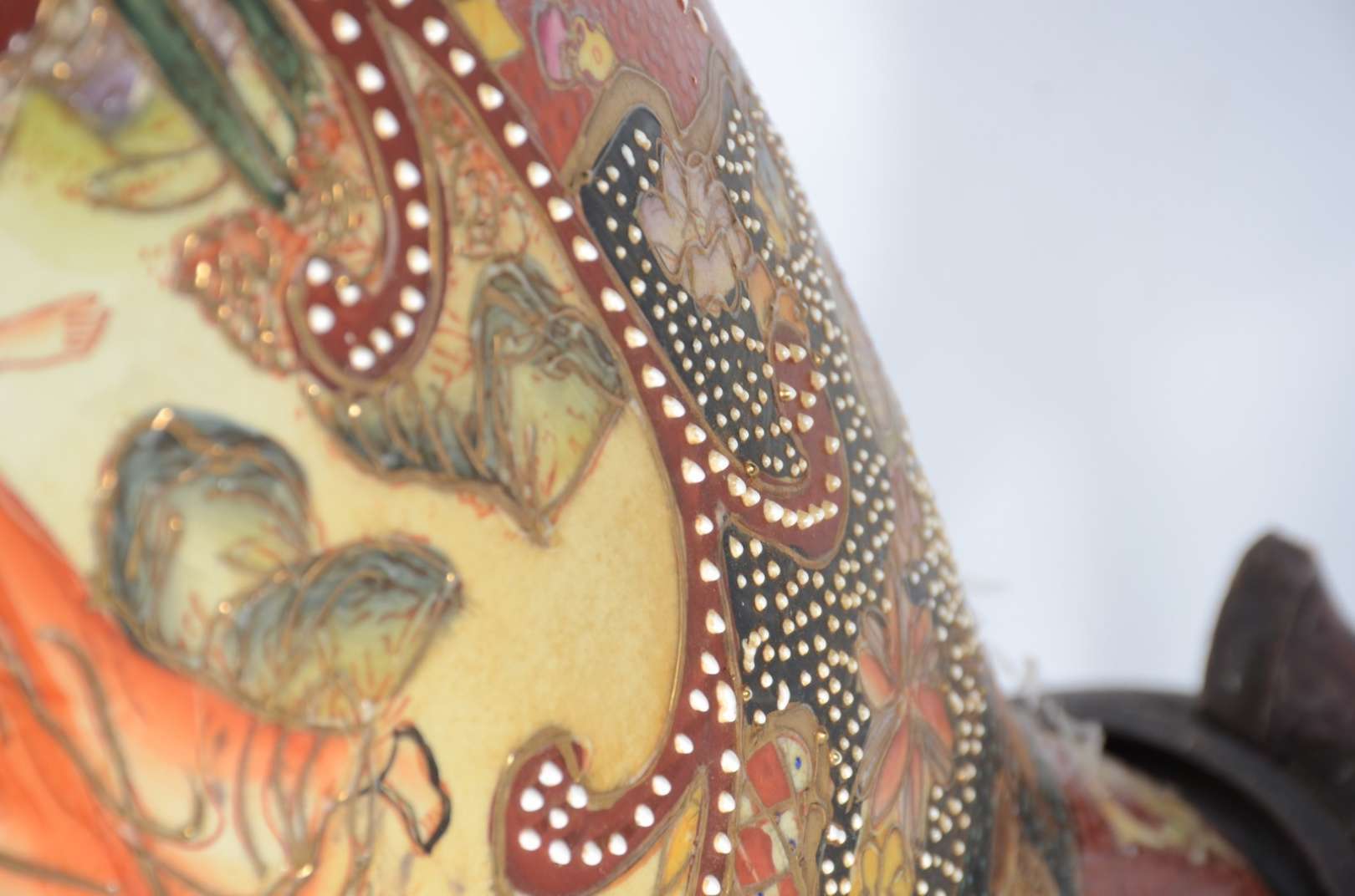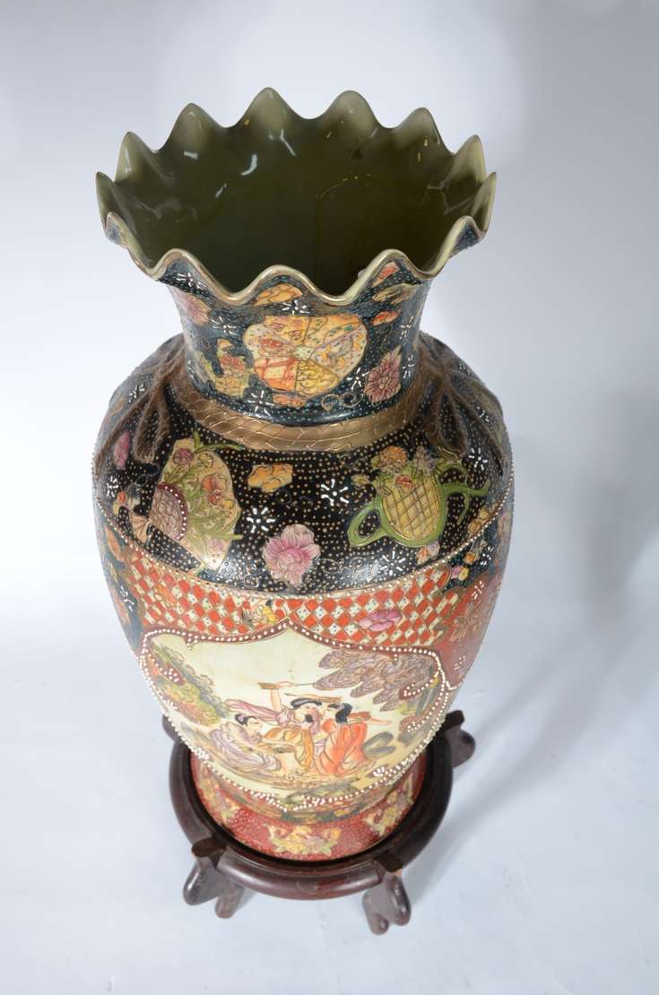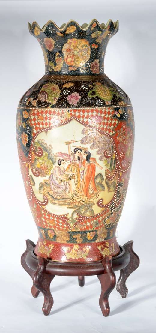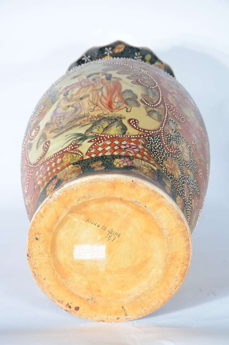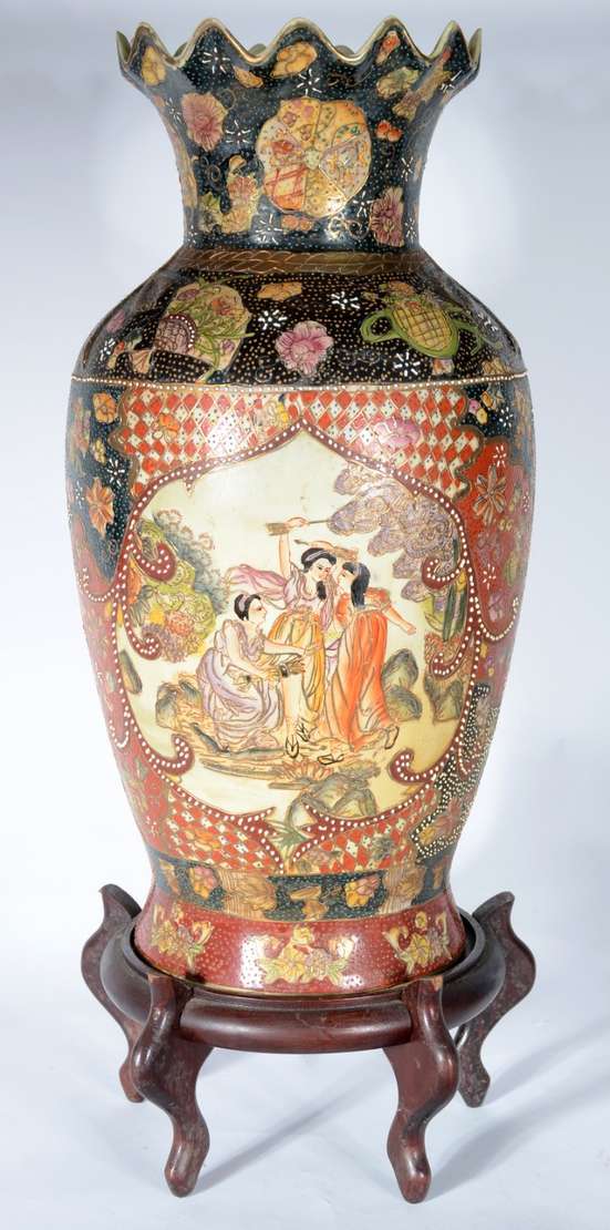 Par de vasos de faiança oriental ao gosto Satzuma, decorados com gueixas, pássaros e flores em policromia, bases de m...