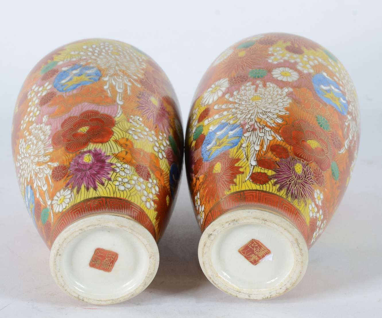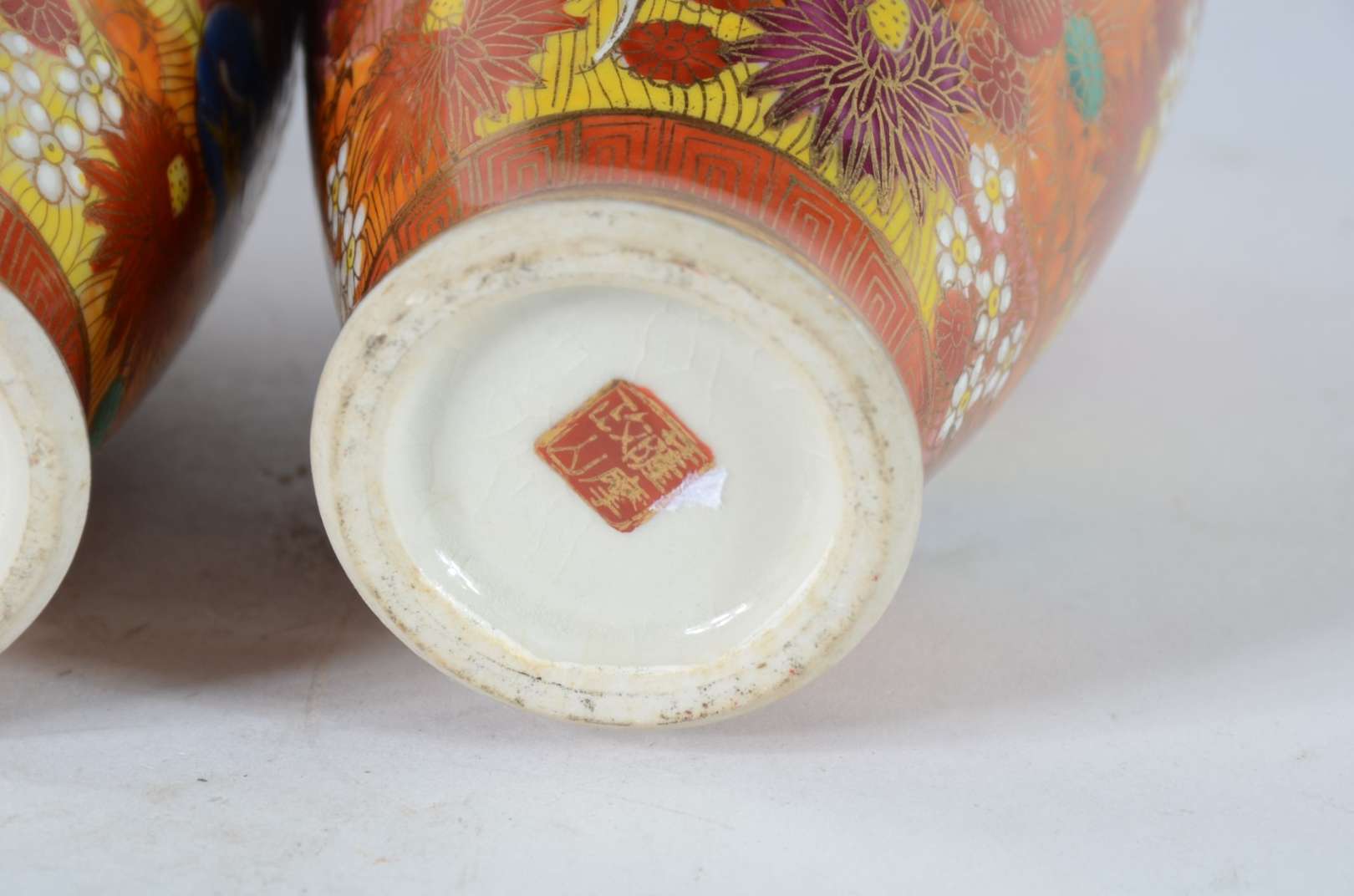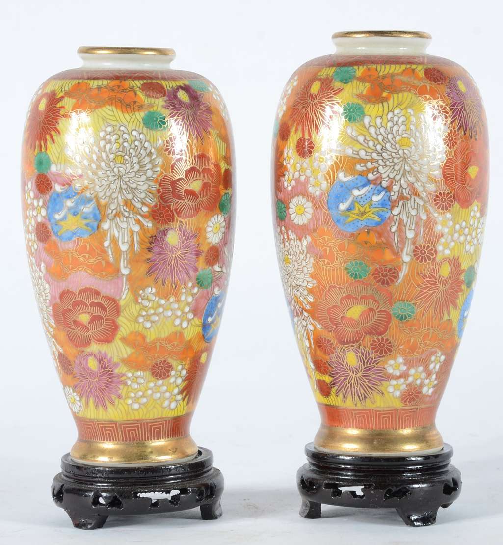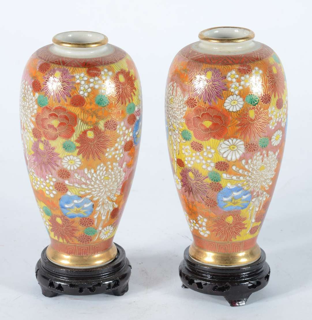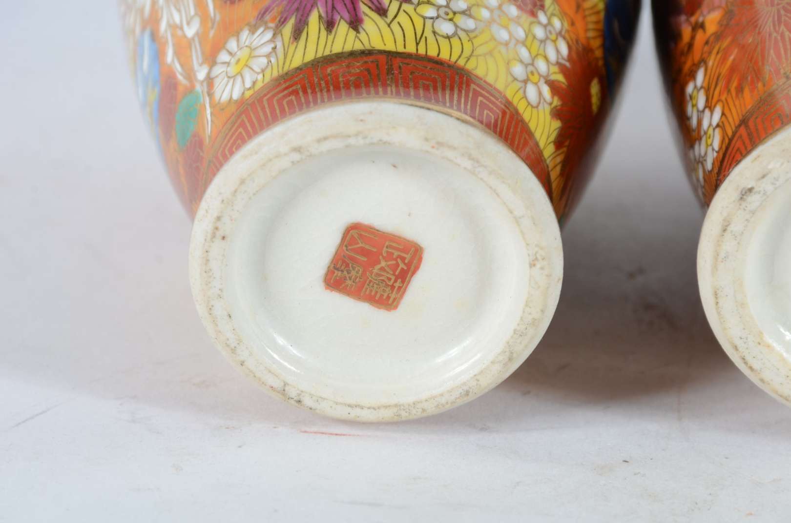 Par de vasos de faiança oriental ao gosto Satzuma, decorados com gueixas, pássaros e flores em policromia, bases de m...