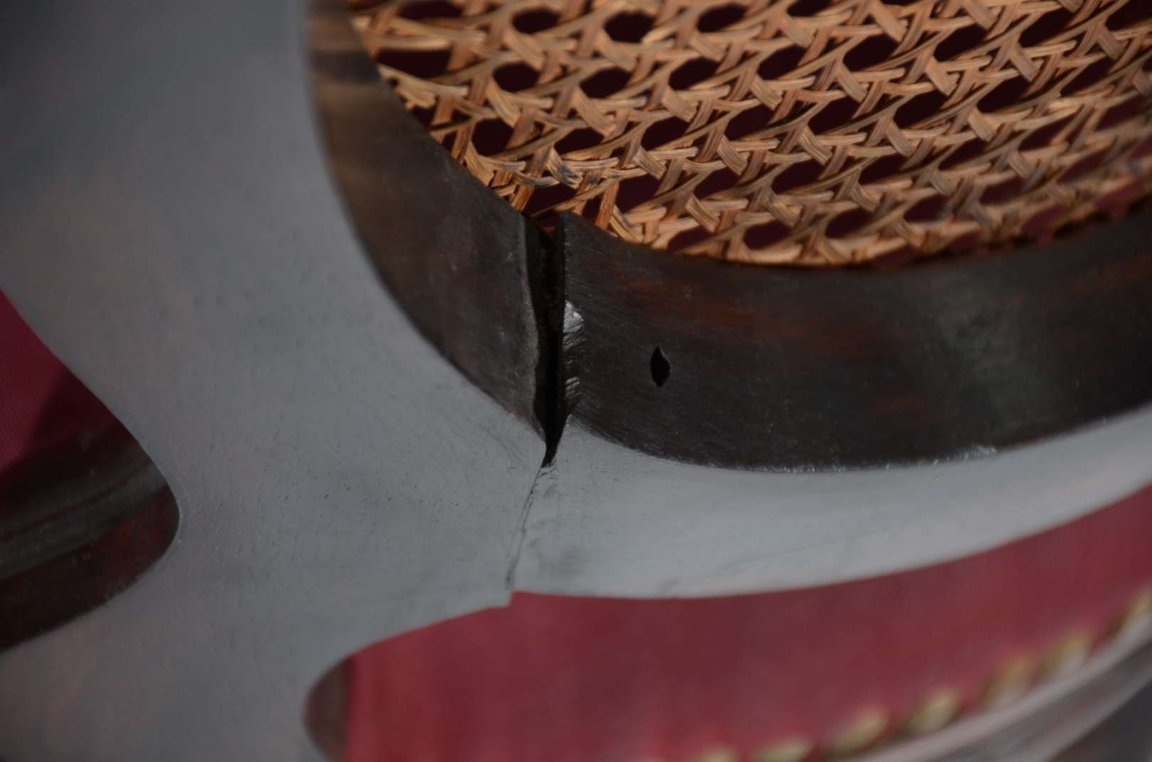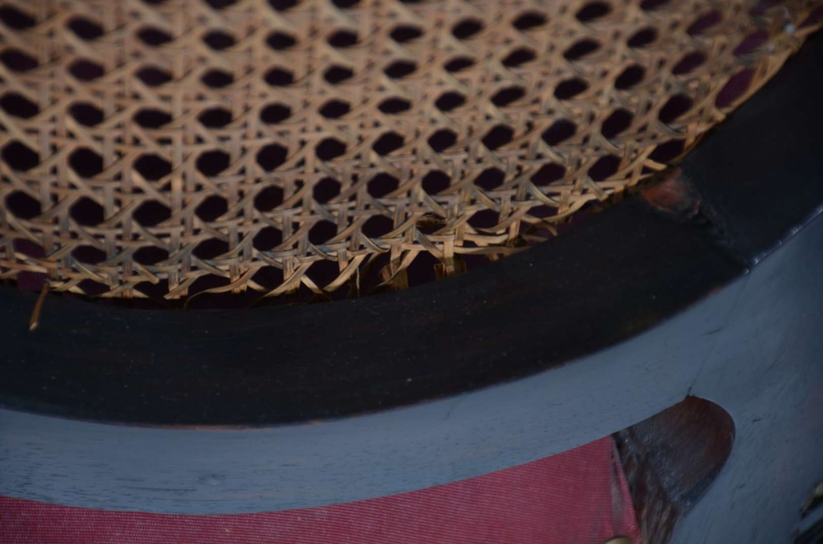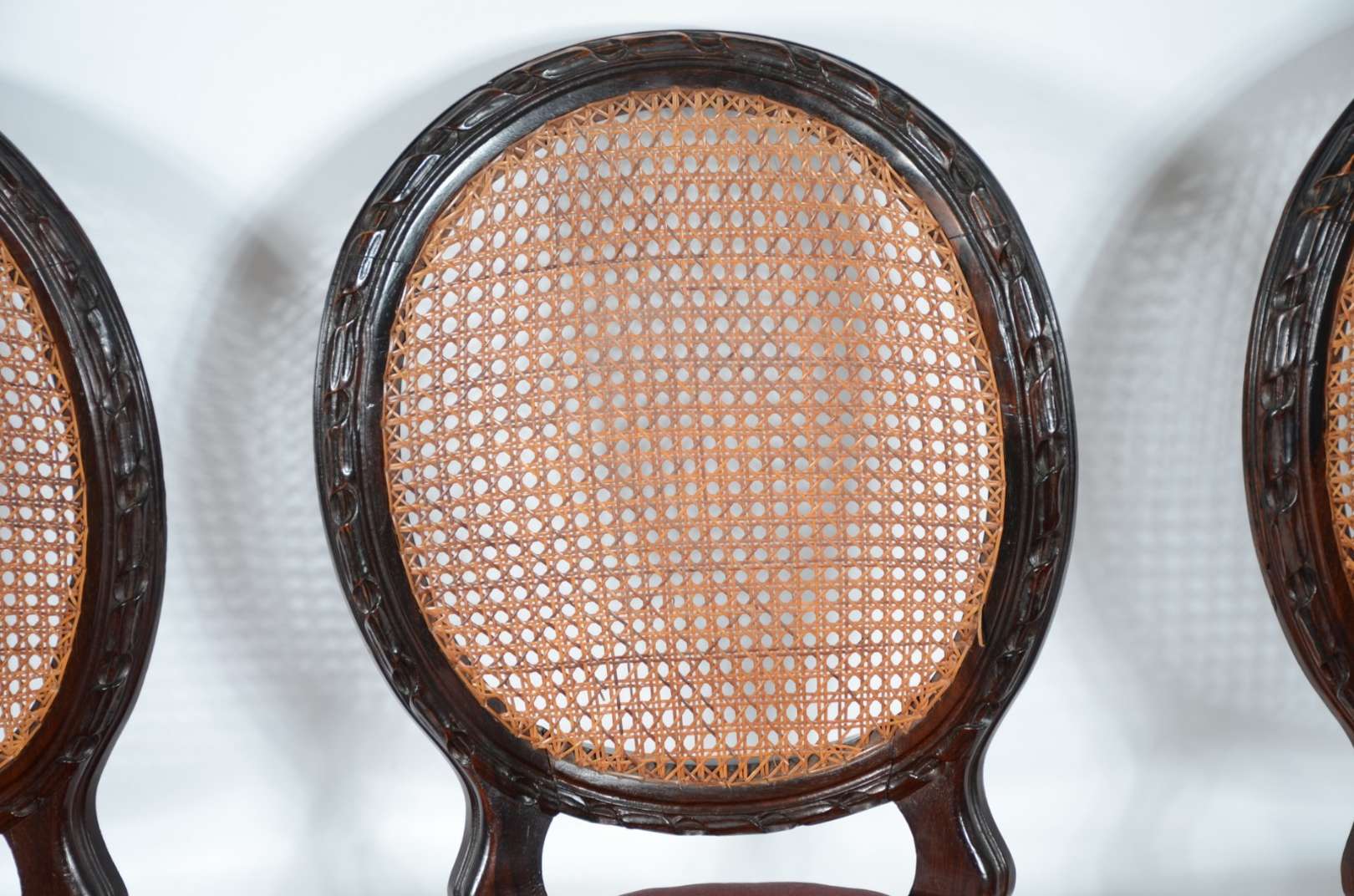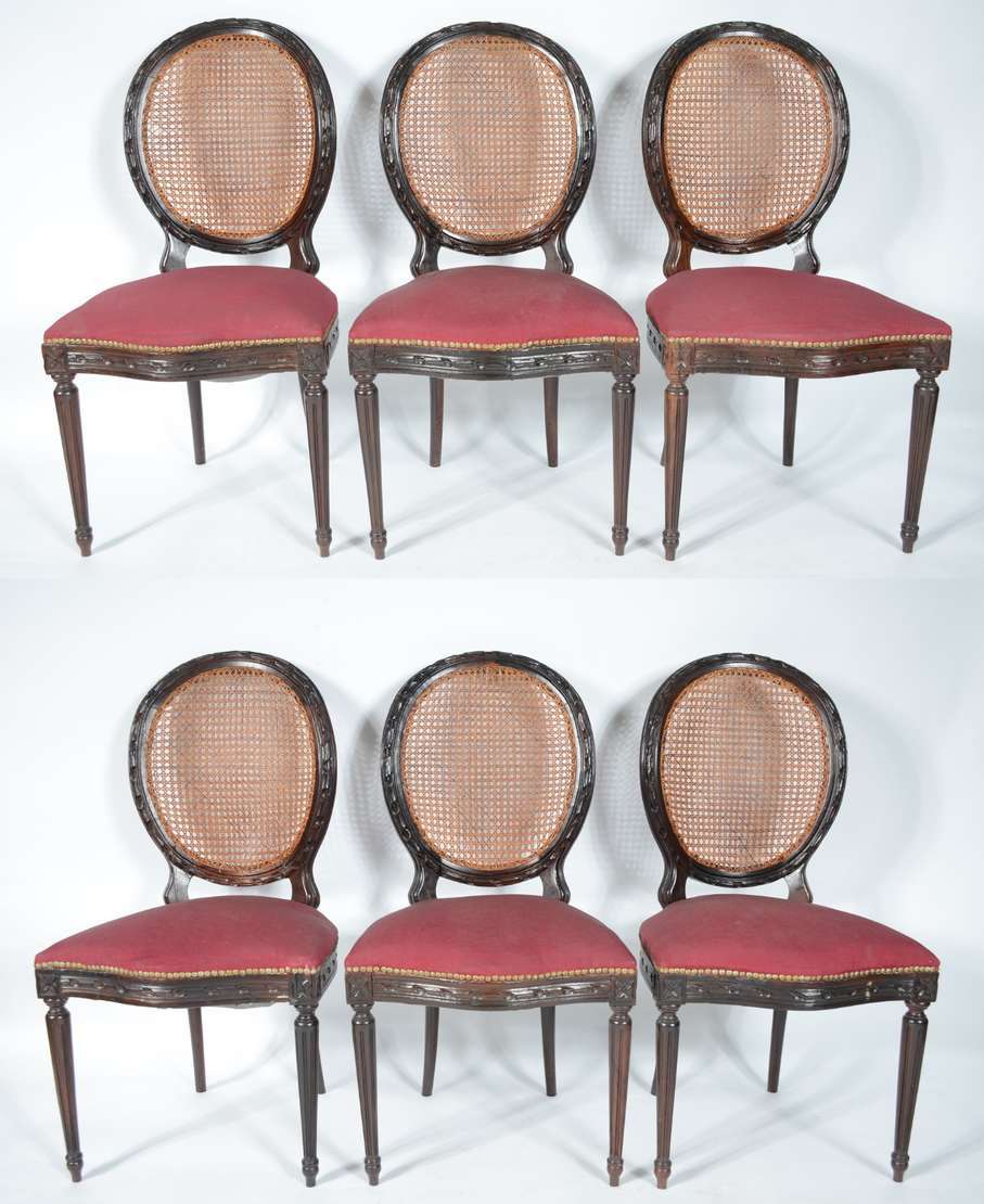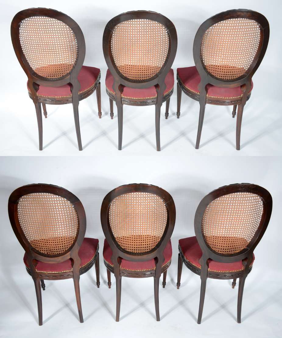Conjunto com 7 cadeiras para mesa de jantar de madeira nobre com encostos de palhinha e assentos estofados. Desgastes...