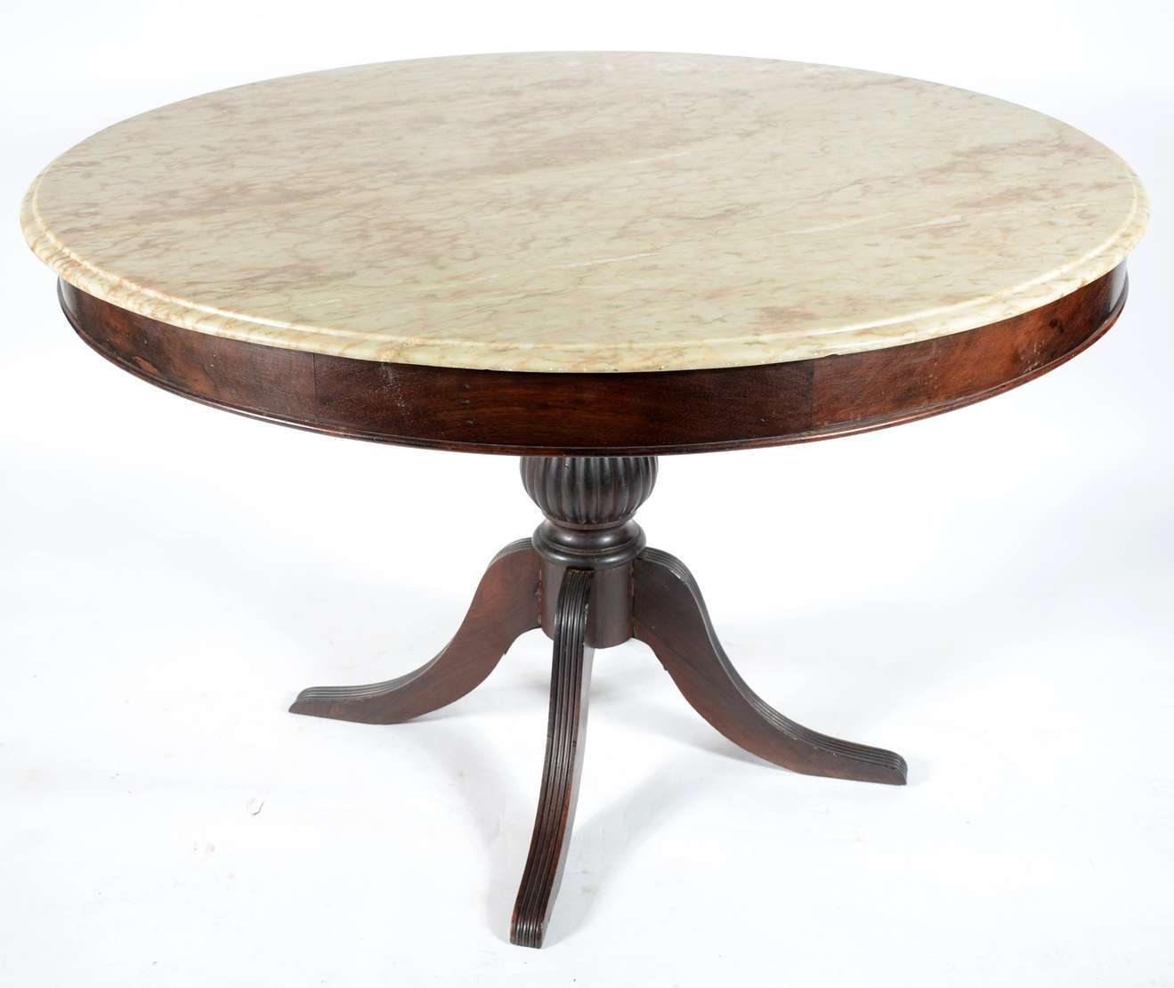 Coluna estilo frances de madeira nobre, tampo redondo de mármore, tres pernas ligeiramente curvas unidas por platô in...