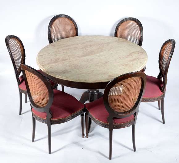 Mesa de jantar de madeira nobre, tampo de mármore apoiado em base feitio balaústre terminando em quatro pernas. Acomp...