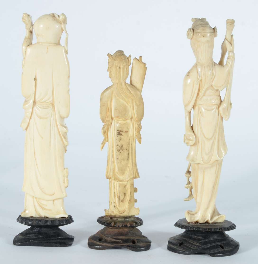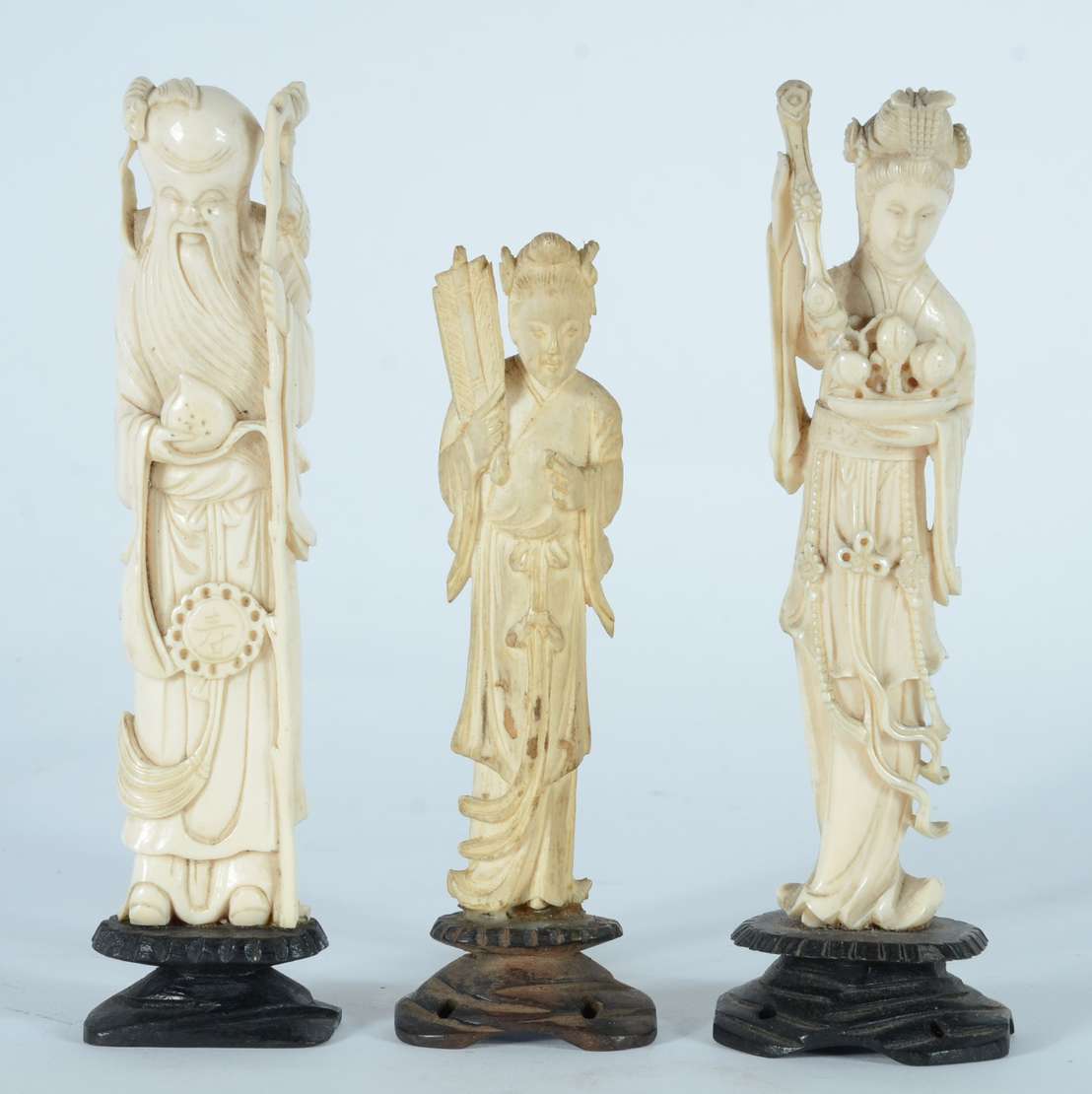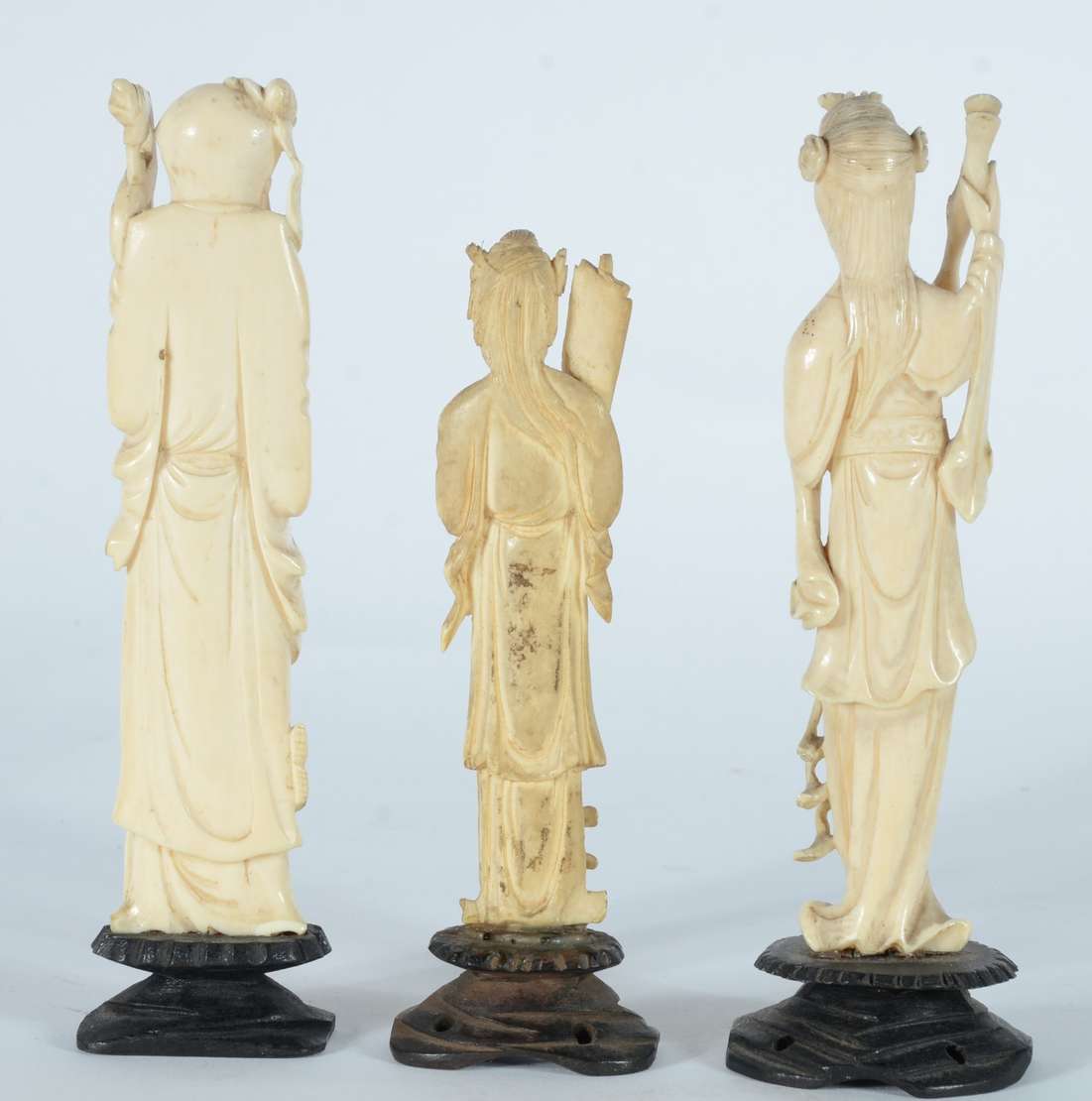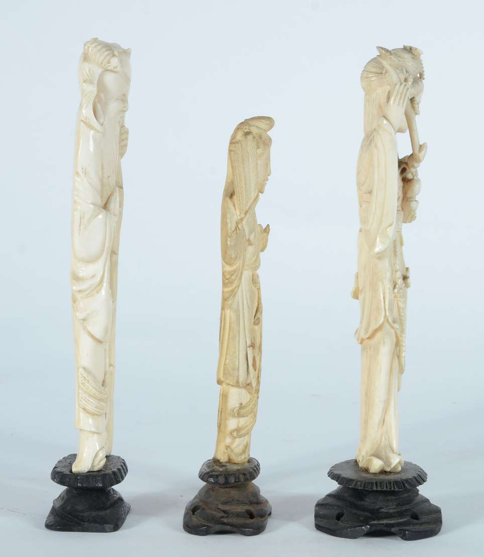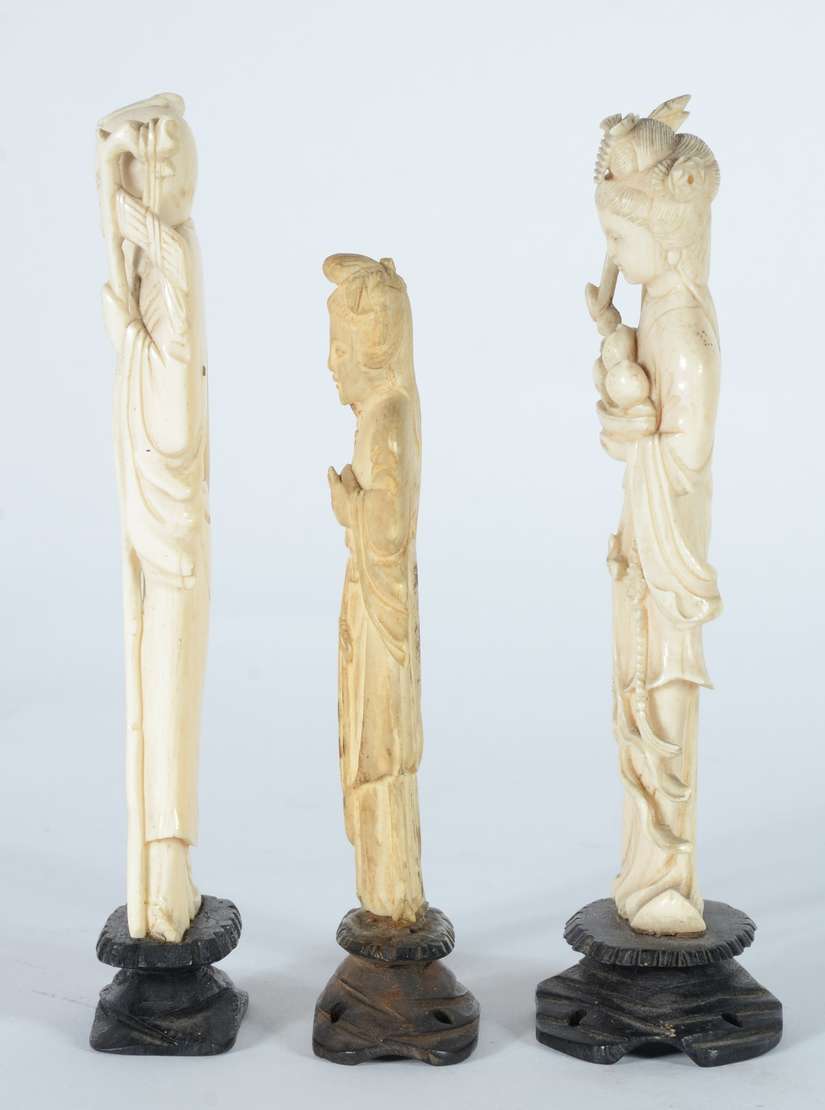 Quatro esculturas de marfim representando figuras de Buda, bases de madeira.