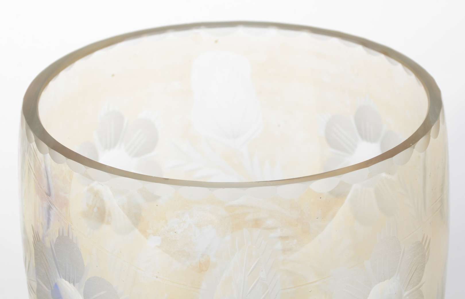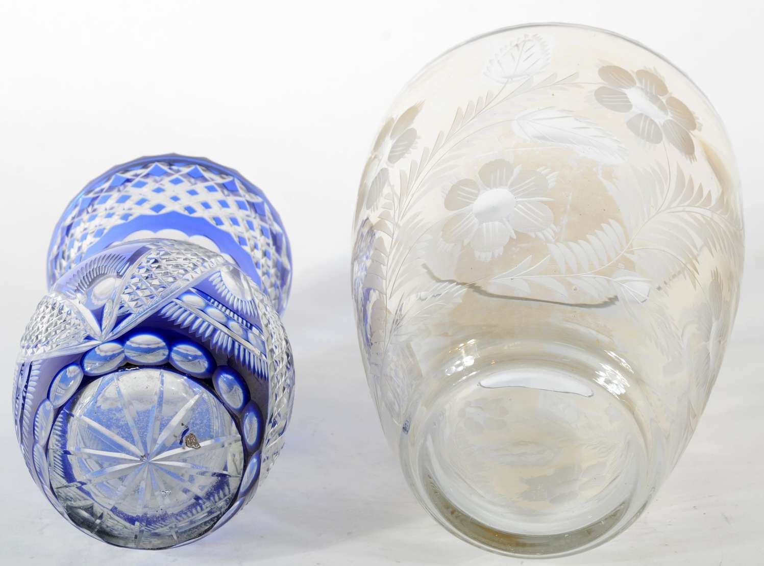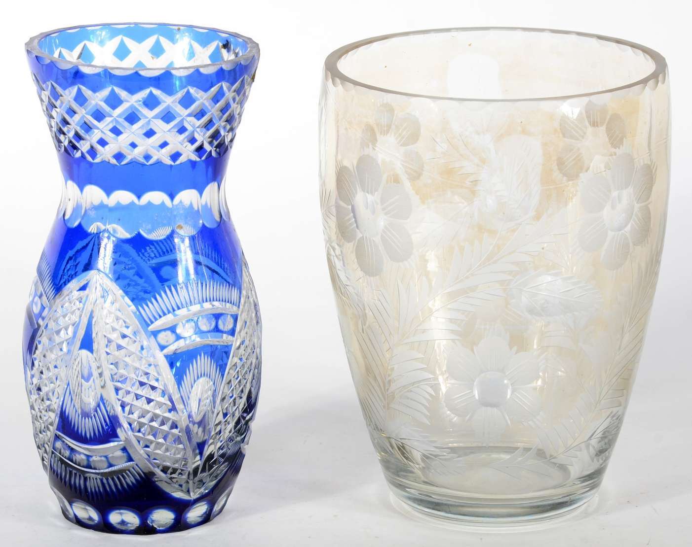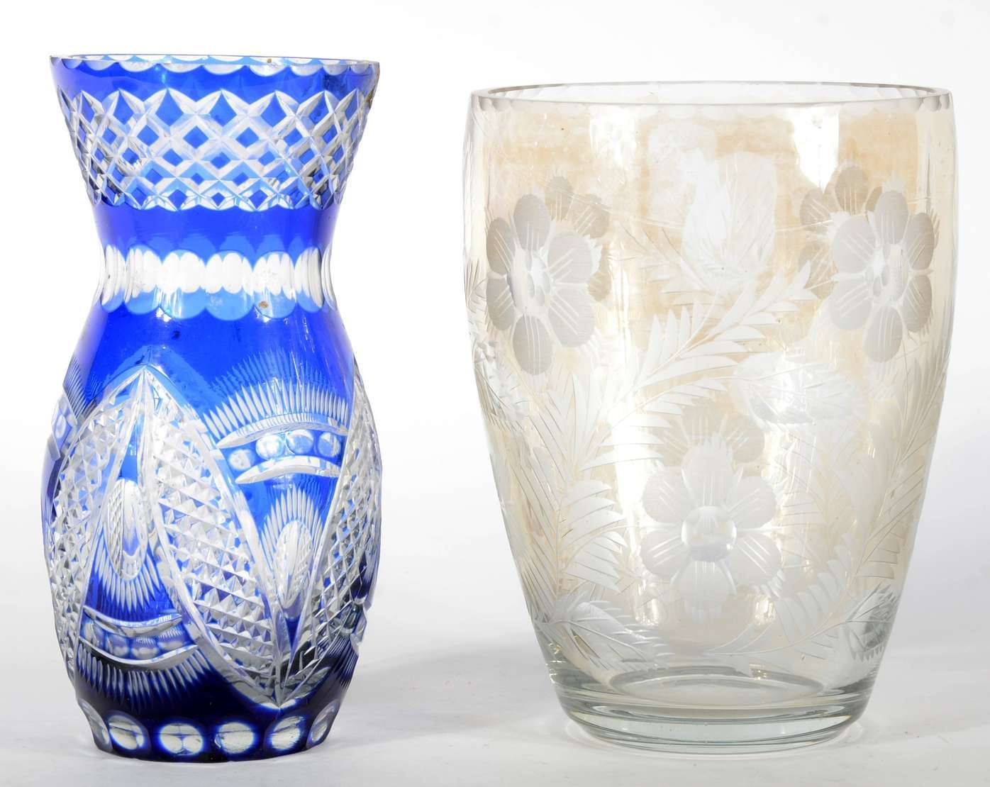 Dois vasos de cristal europeu lapidado com flores e folhas, sendo um doublé rubi e outro doublé azul.