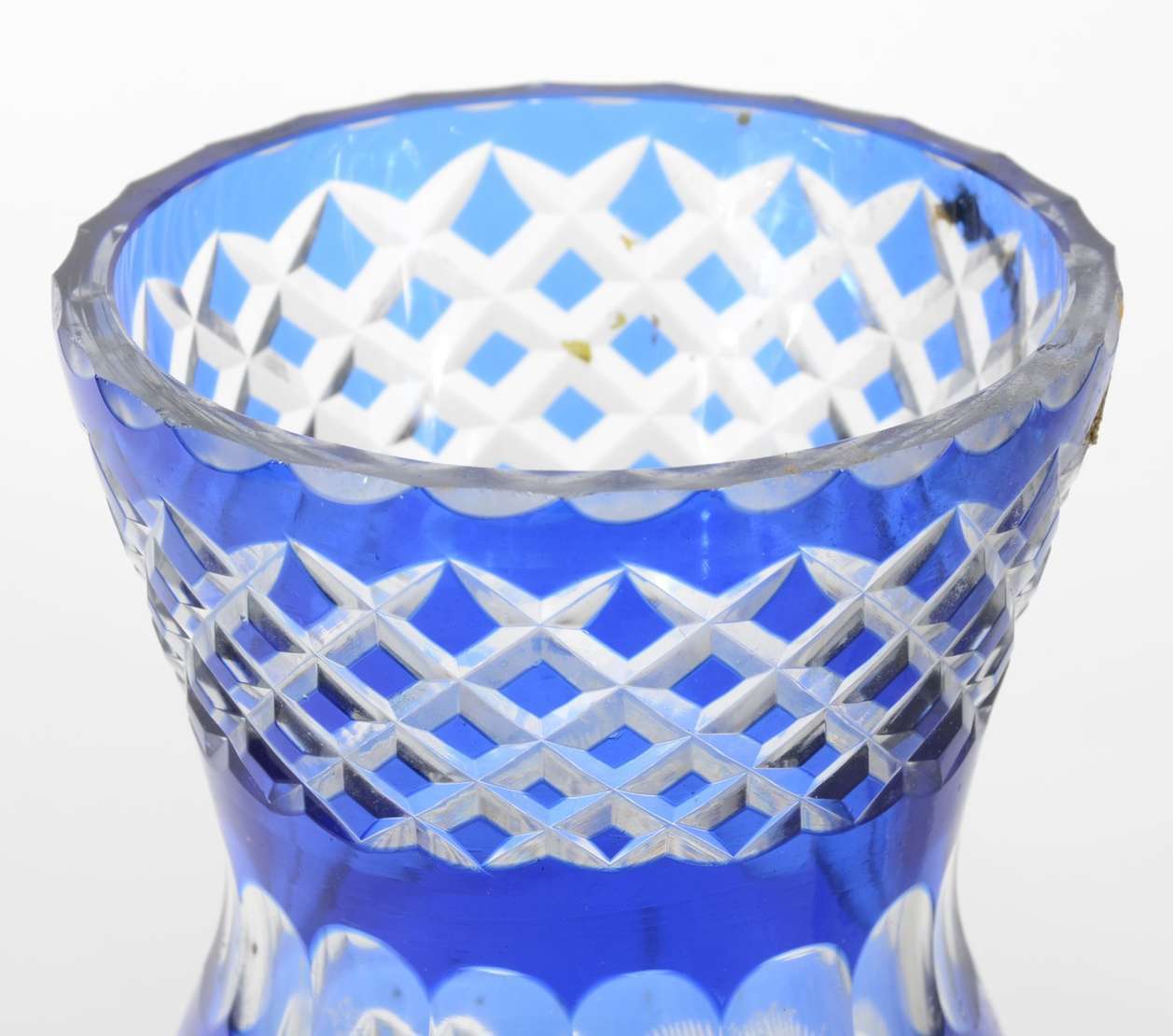 Vaso de vidro decorativo na cor azul com pó de ouro.