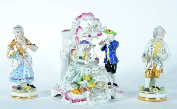 Três grupos escultóricos de porcelana policromada representando figuras de camponeses e casal com criança.