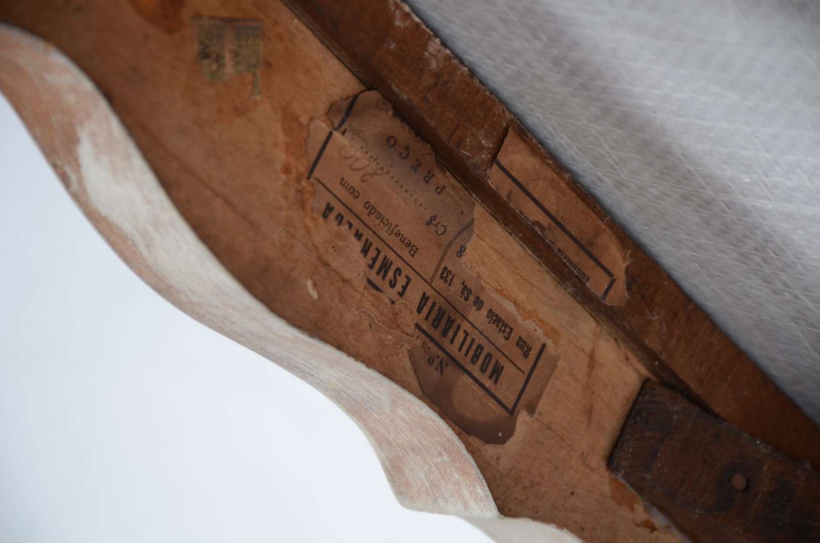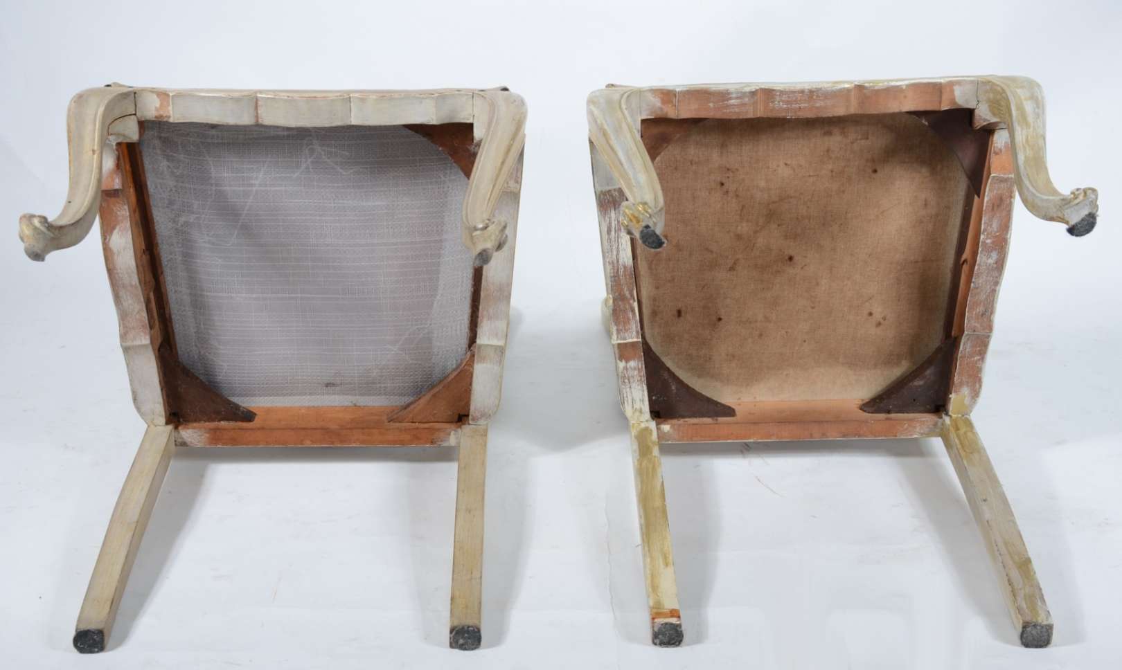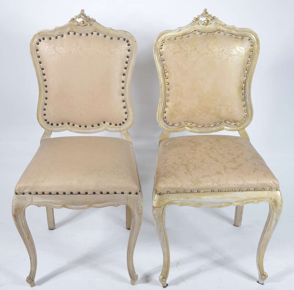 Par de cadeiras de madeira, estofadas e forradas em tecido cinza. Estofado com algumas manchas.