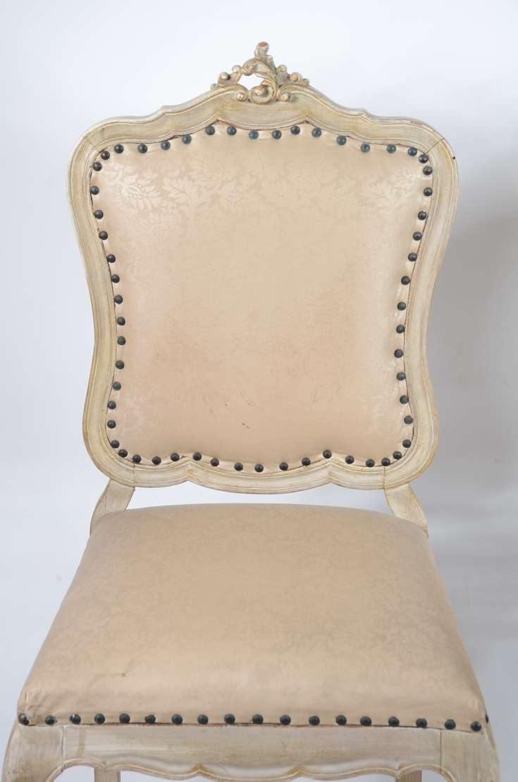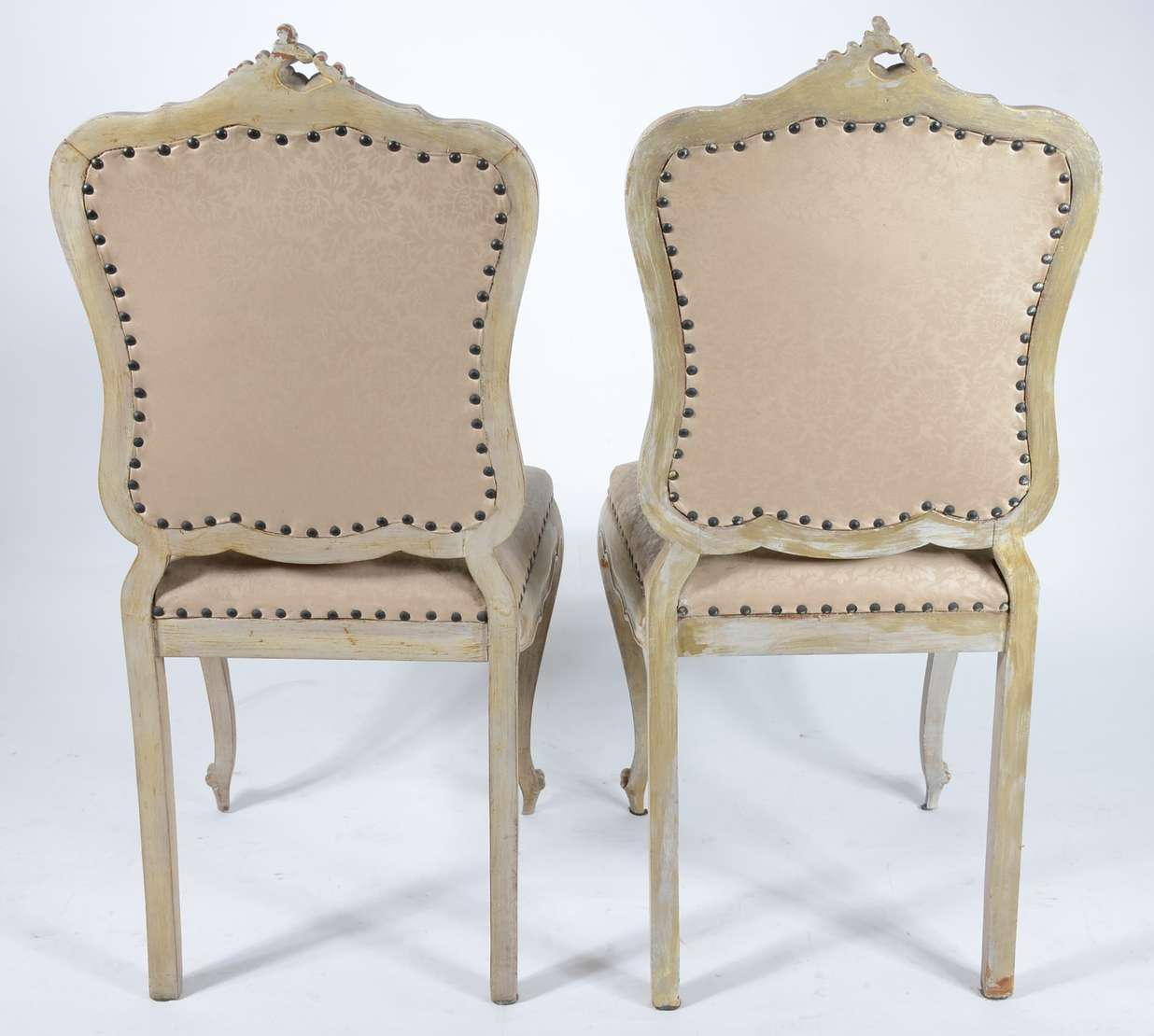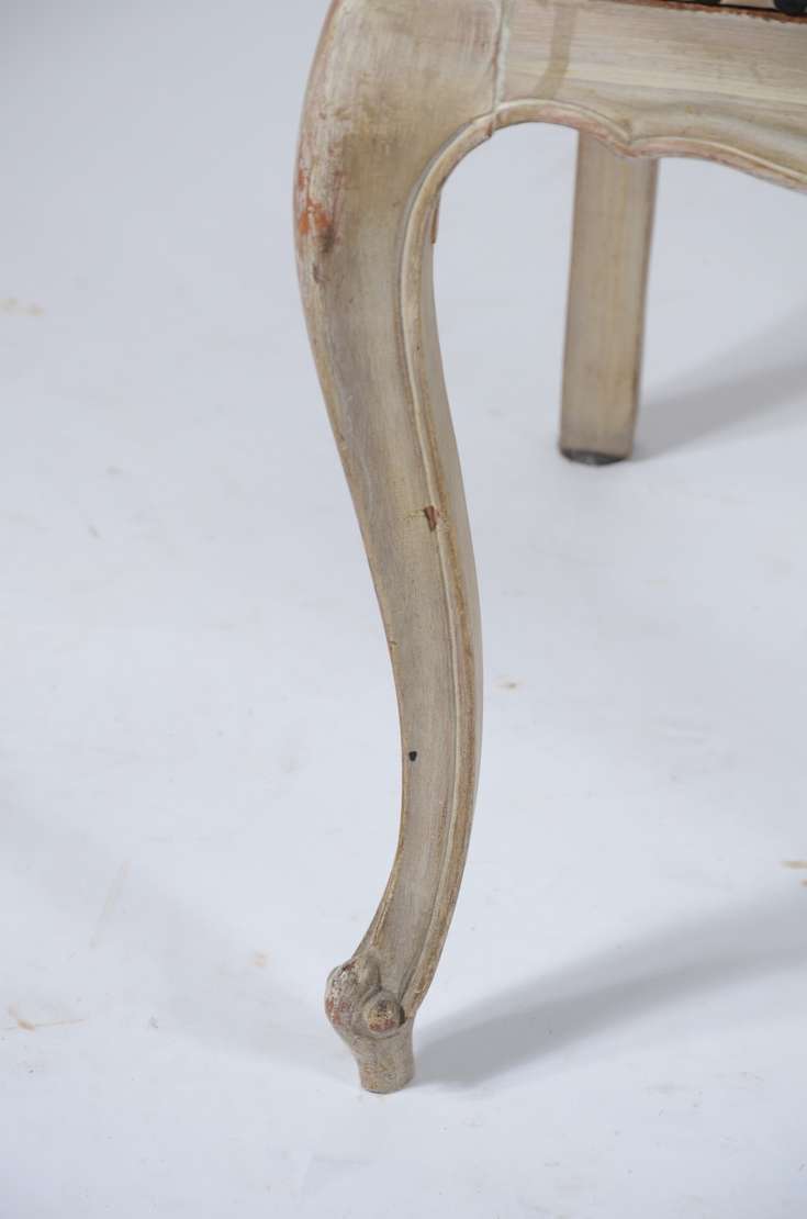 Par de cadeiras de madeira, estofadas e forradas em tecido cinza. Estofado com algumas manchas.