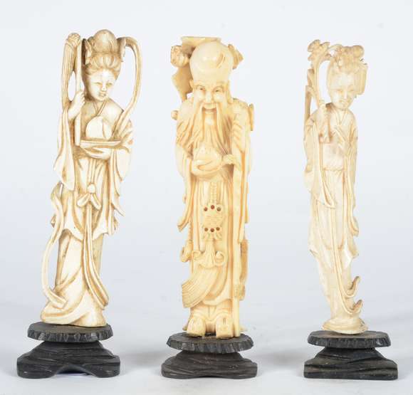 Três peças de marfim representando duas gueixas e um ancião, bases de madeira.