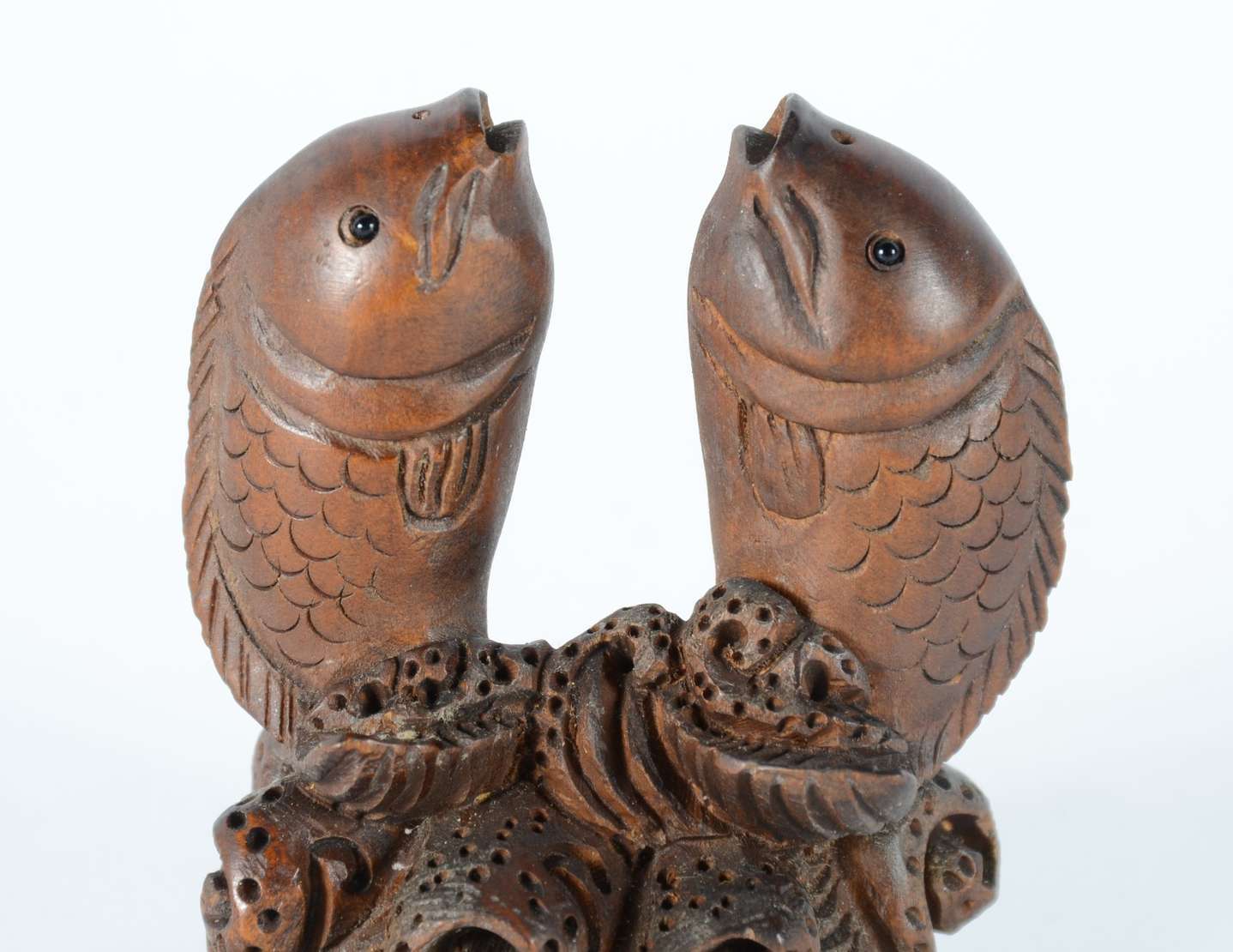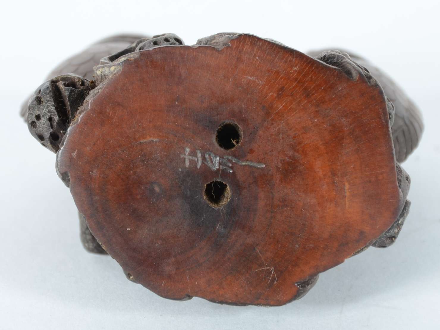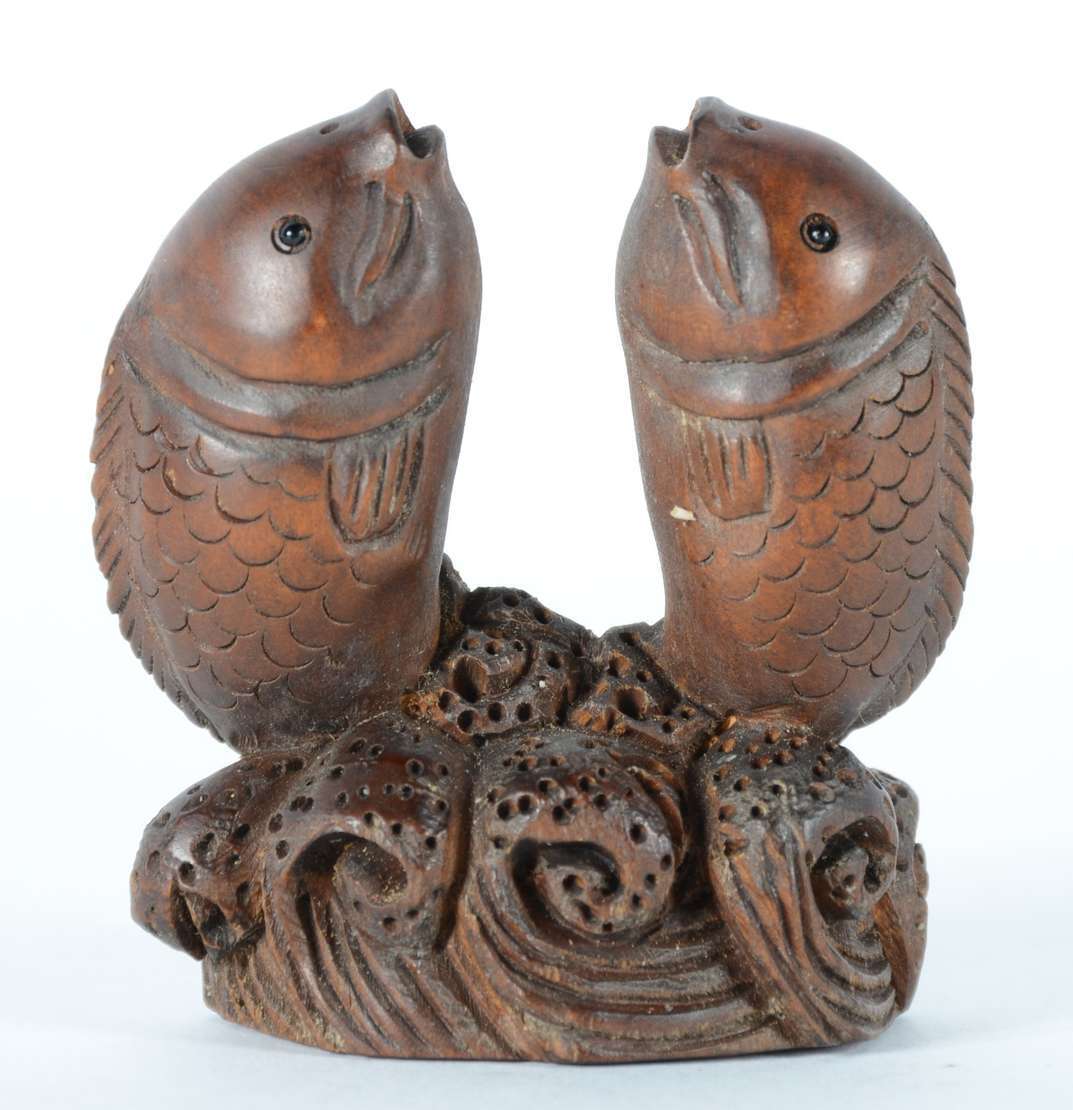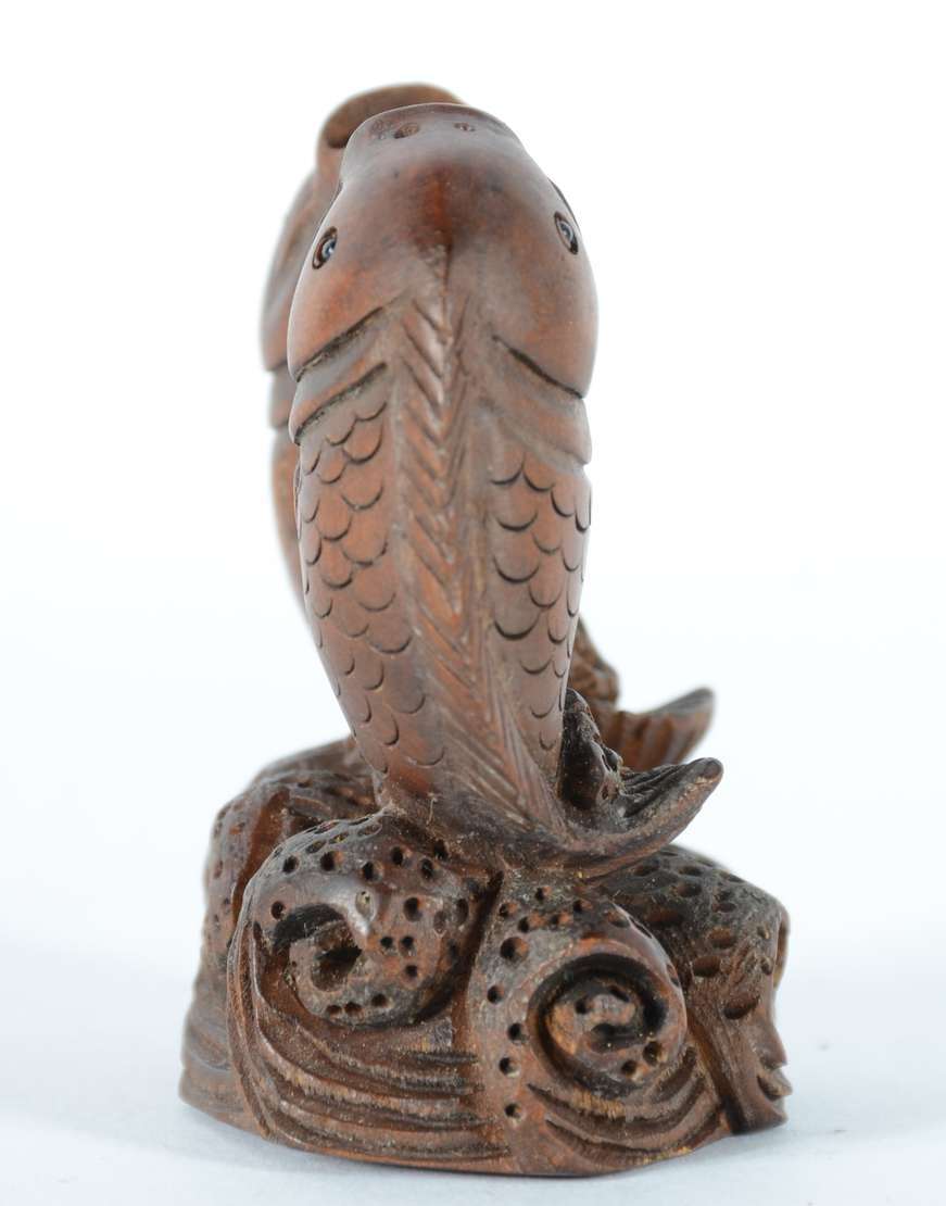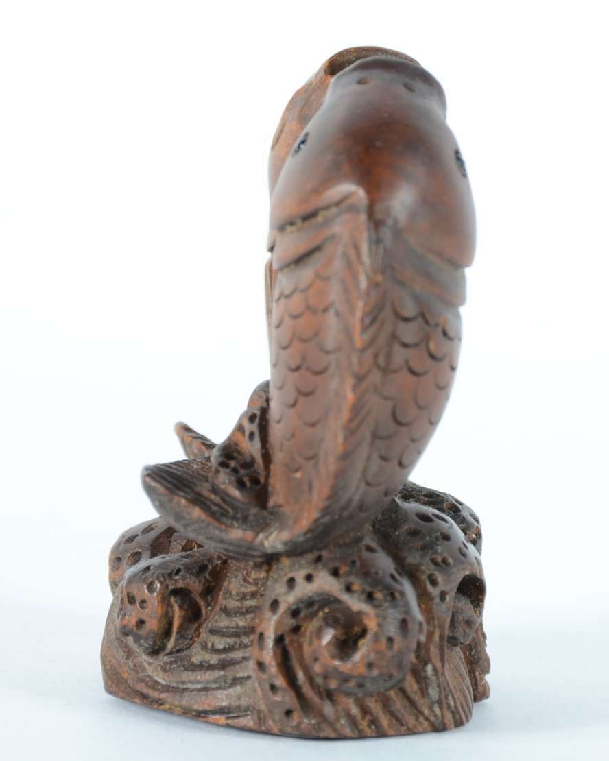 Netsuke de madeira representando cachorro.