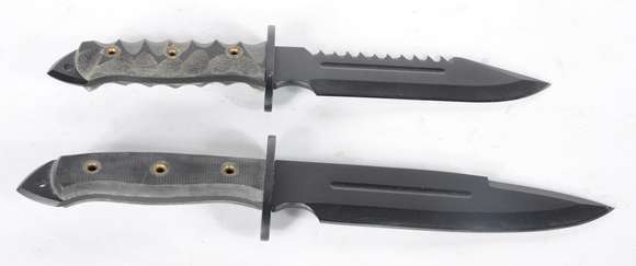 Duas facas em aço carbono, sendo uma com "caveira" do Bope e outra modelo "quati".