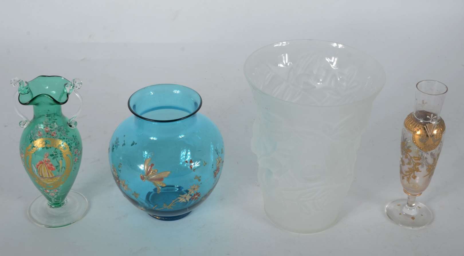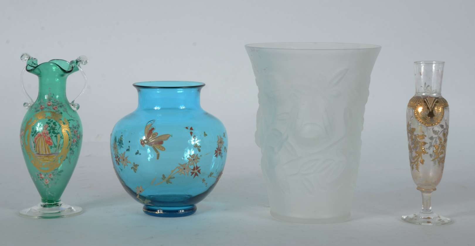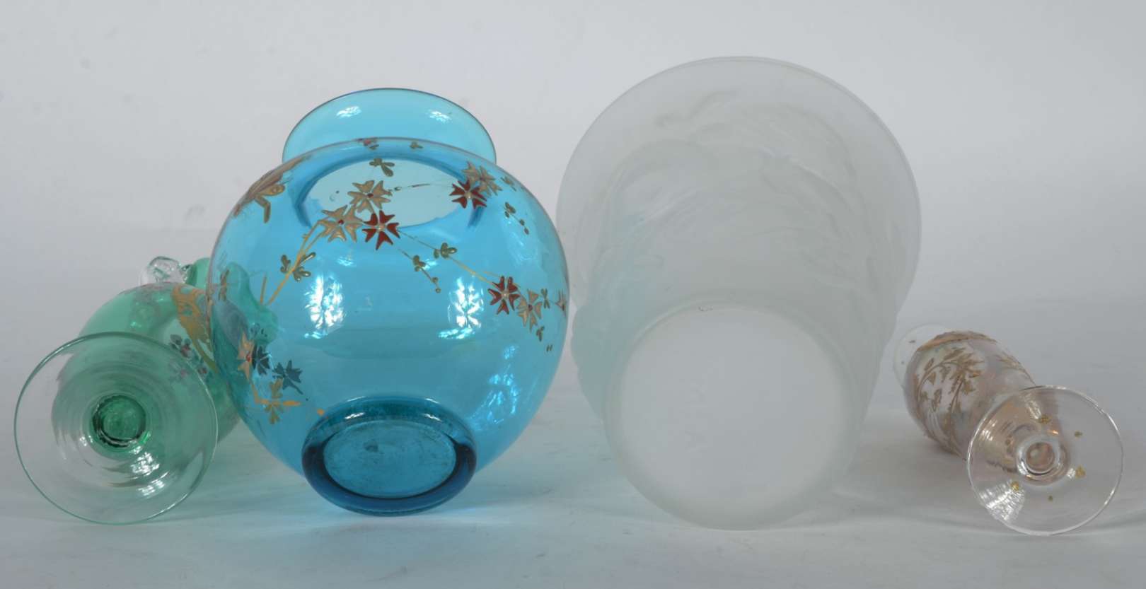 Quatro vasos diversos de cristal colorido com dourado.