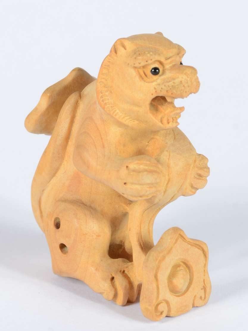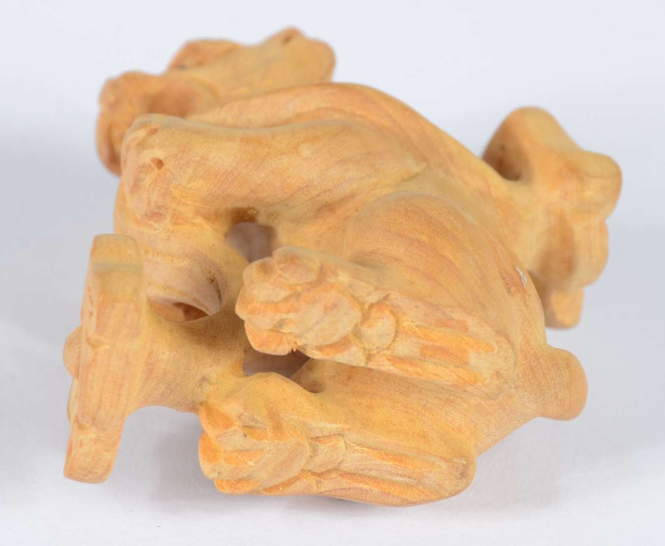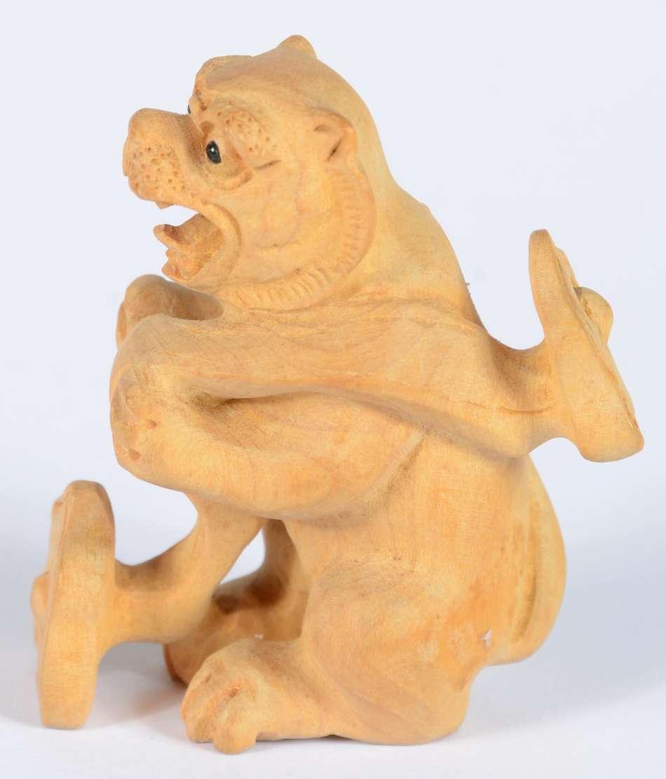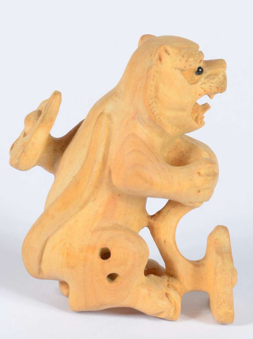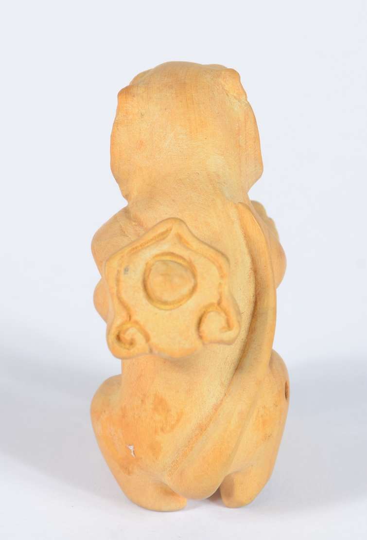 Netsuke de madeira representando buda com cesto.
