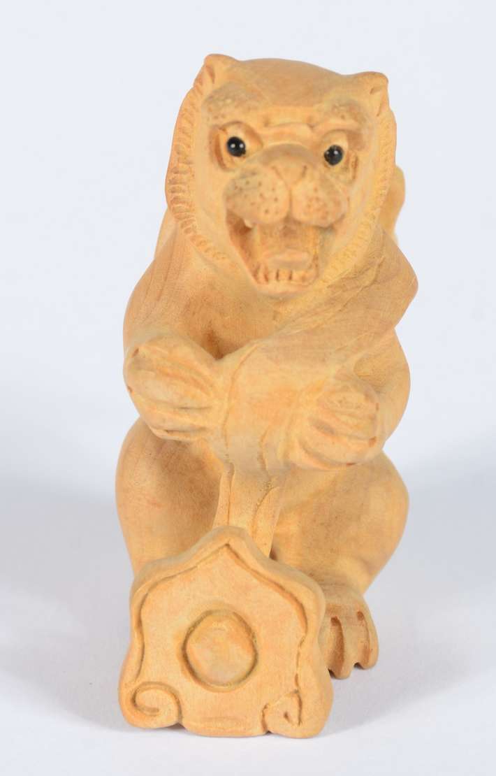 Escultura de marfim representando figura masculina segurando "homem".