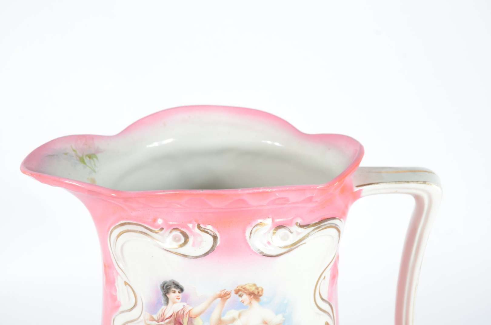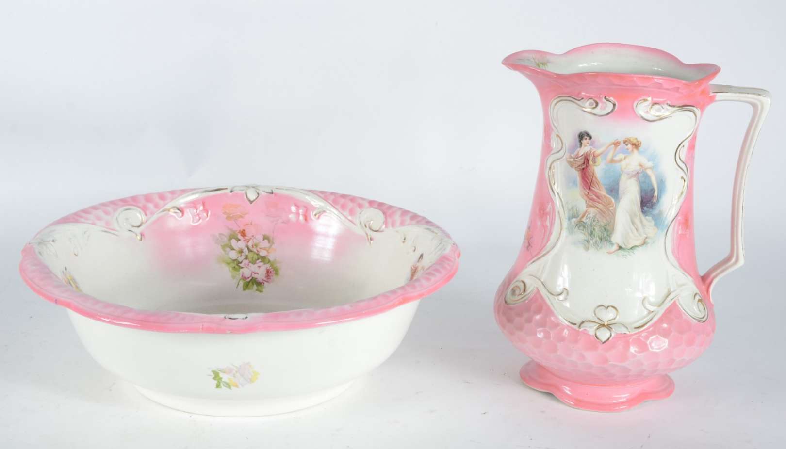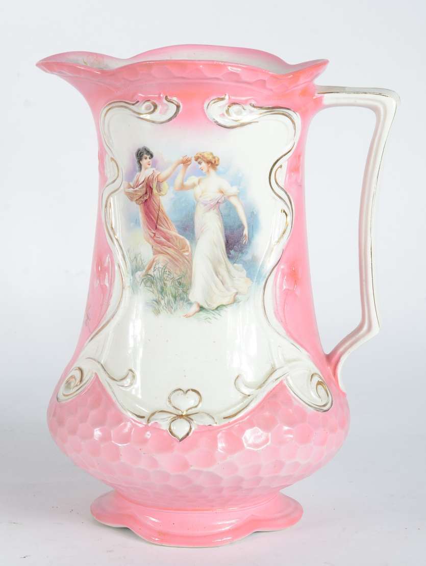 Diversas peças, sendo: vaso de vidro com resquícios de frisos dourados; Fruteira de metal com interior de vidro rosa ...