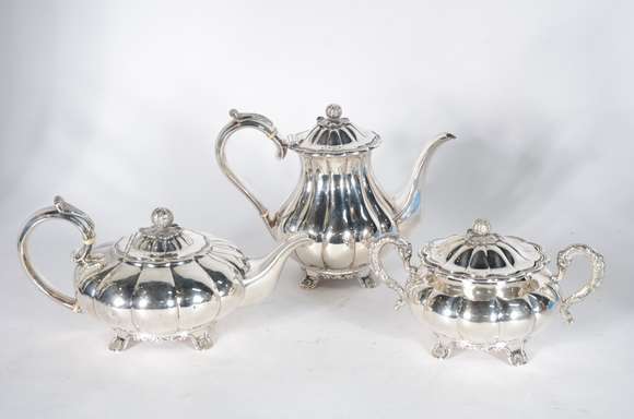 Baixela para chá e café de prata de lei, composto de: bule para chá, bule para café e açucareiro sem tampa com interi...