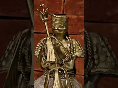 Estatueta de faiança oriental Satzuma em policromia com realces dourados representando figura feminina.