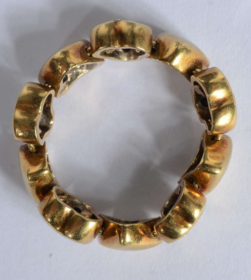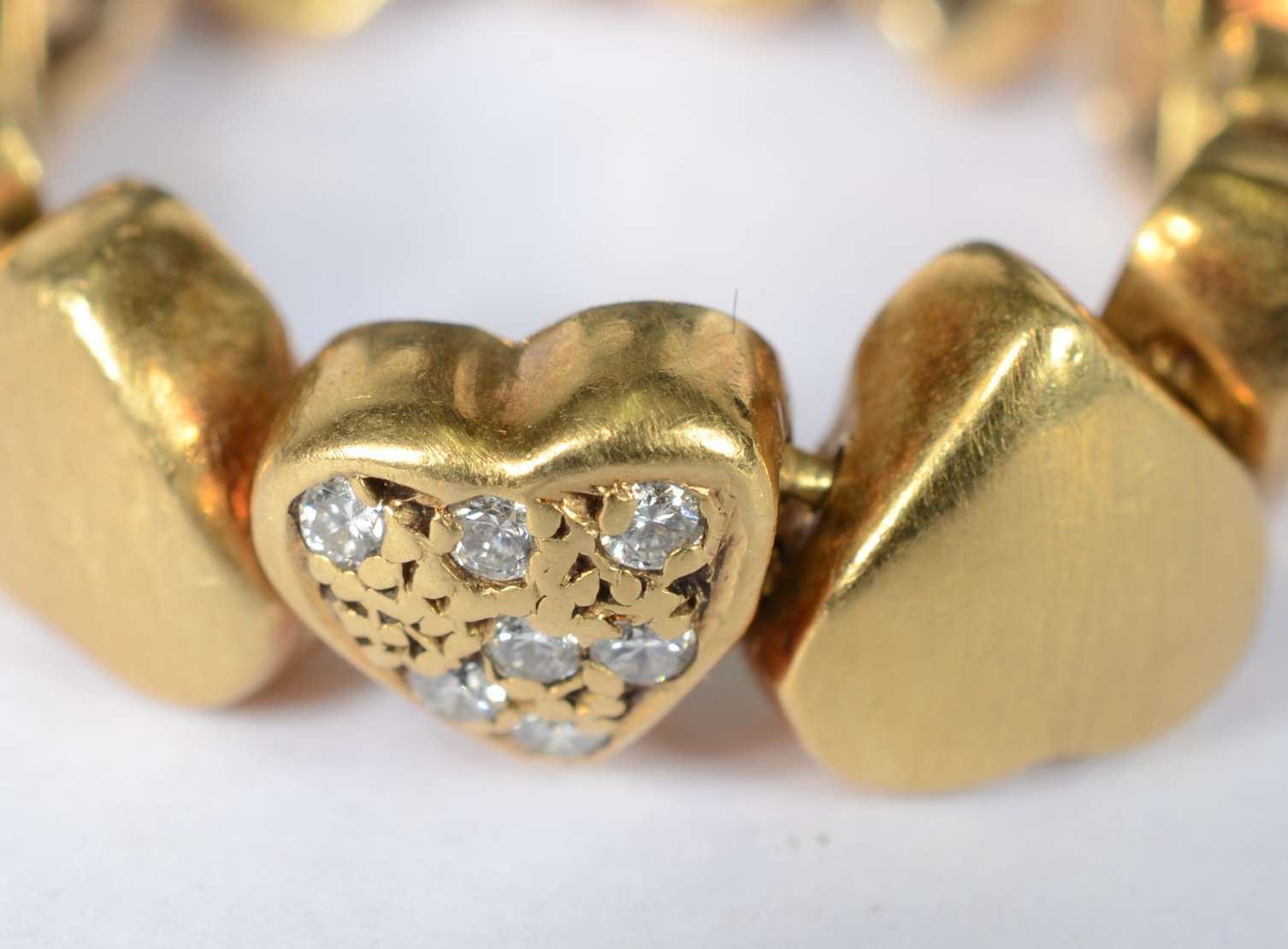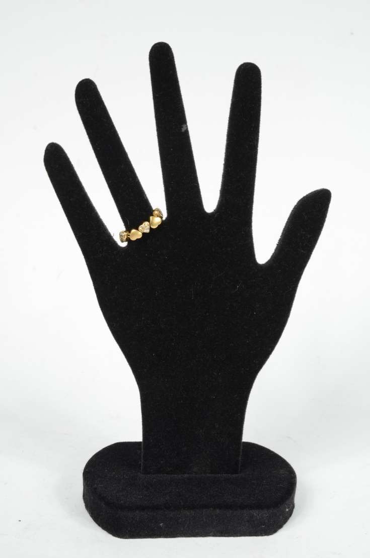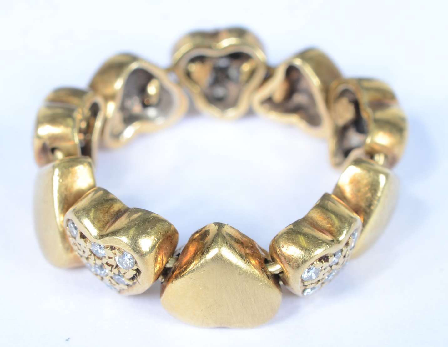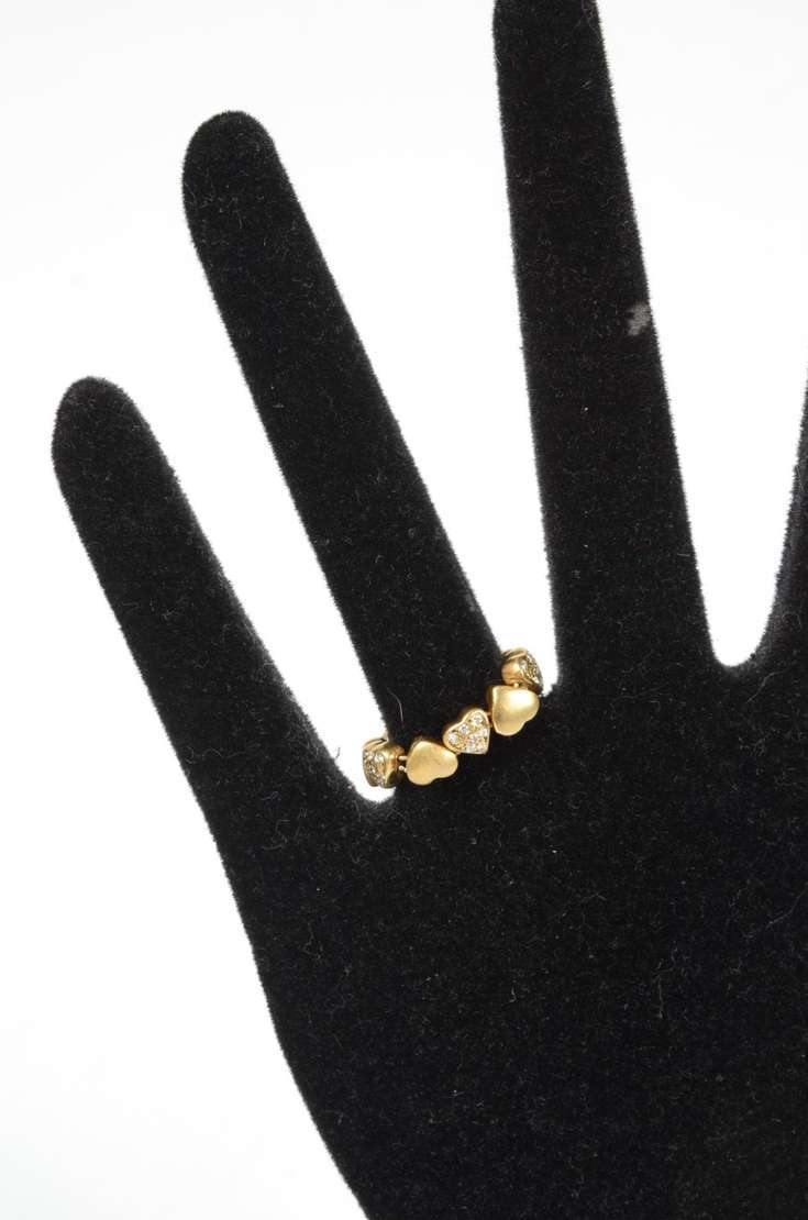 Anel maleável de ouro 18 k., contraste 750 mls com 5 corações cravejados com brilhantes. Aro 19. (Por motivos de segurança a peça não se encontra na loja).