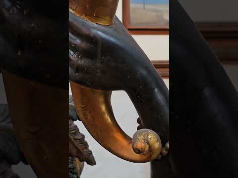 Excepcional blackamoor esculpido em madeira laqueada de negro, representando núbia sorrindo, tendo na mão esquerda cornucópia dourada; apresenta-se vestida de túnica amarrada á cintura por faixa, na cabeça um turbante com adorno de plumas e pedra, nos braços e na perna direita pulseiras. As vestes são ricamente ornamentadas em policromia e ouro. A túnica é arrematada por imitação de renda dourada. Socle octogonal, base imitando mosaico. Defeitos na pintura. Século XIX. Já teve infestação de cupim na parte inferior da peça. (Reproduzido com foto no Catálogo do Leilão de Leone, novembro de 1988 - RJ)