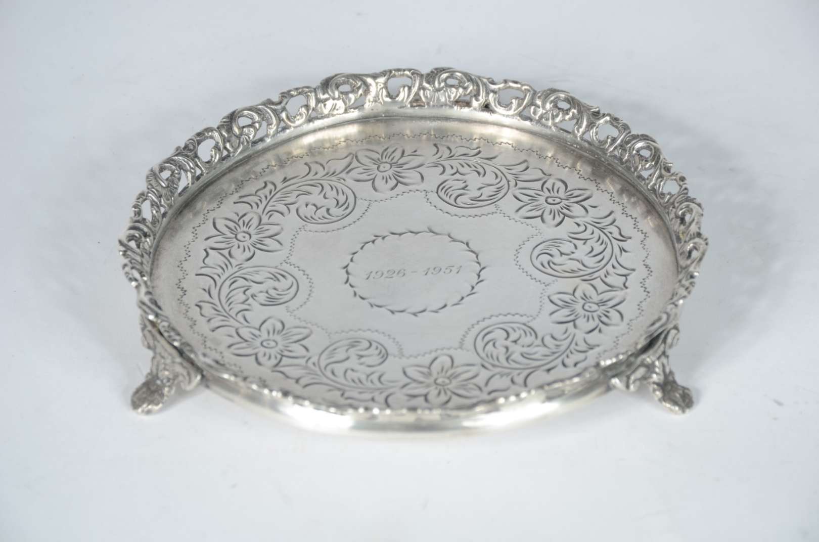 Bandeja com alças de metal prateado, fundo cinzelado e borda recortada. Desgastes.