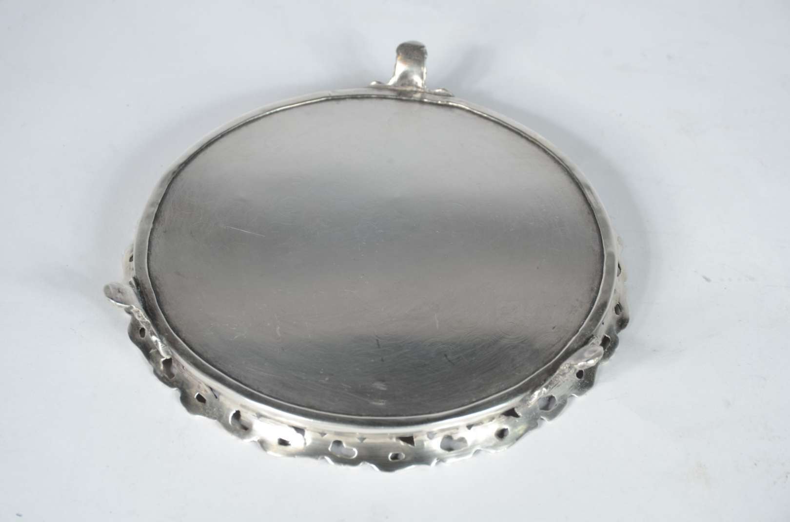 Bandeja com alças de metal prateado, borda trabalhada em relevo.