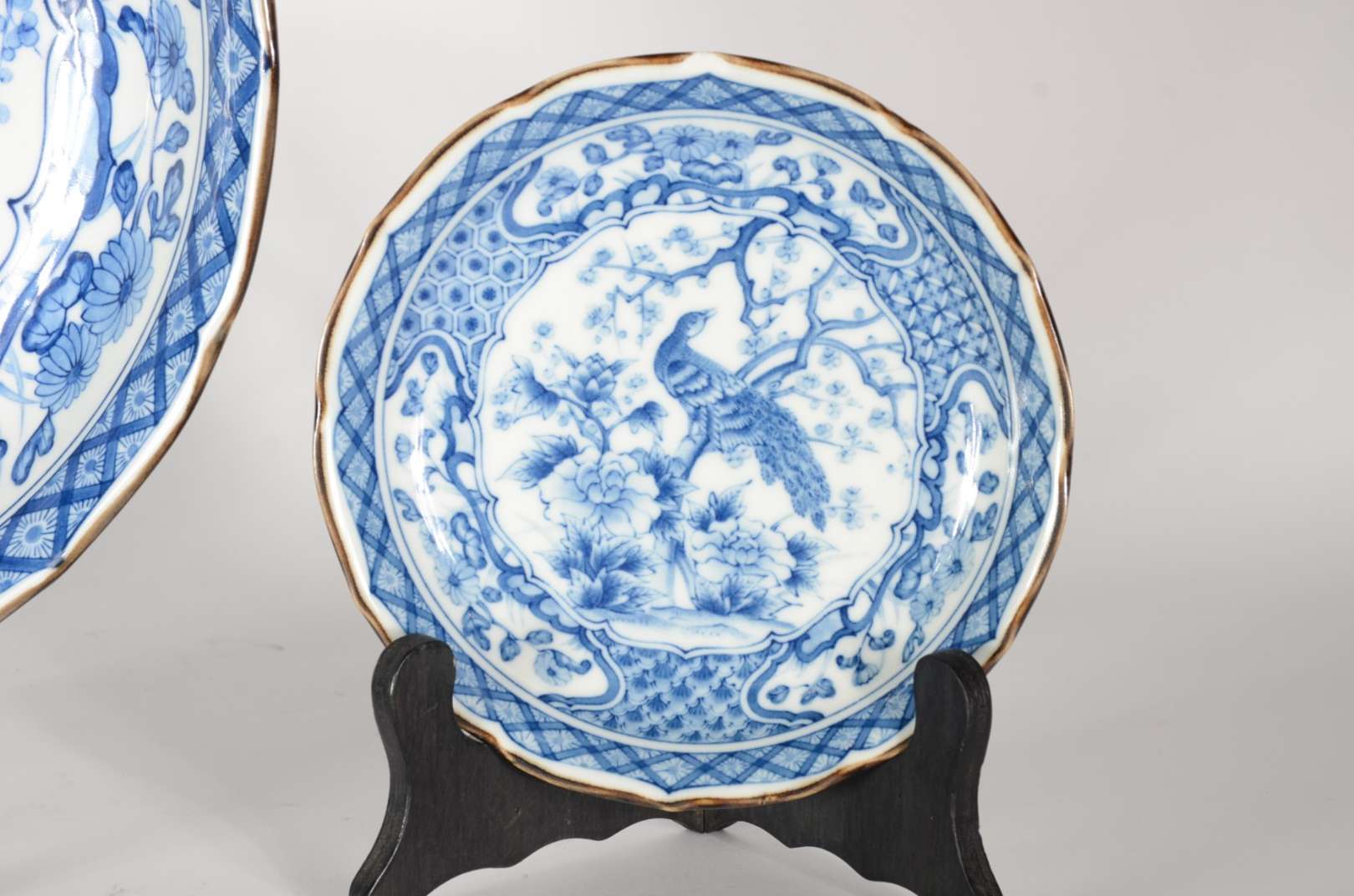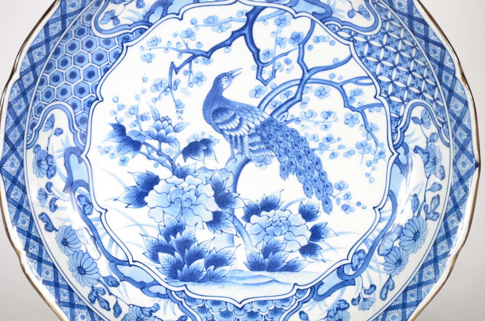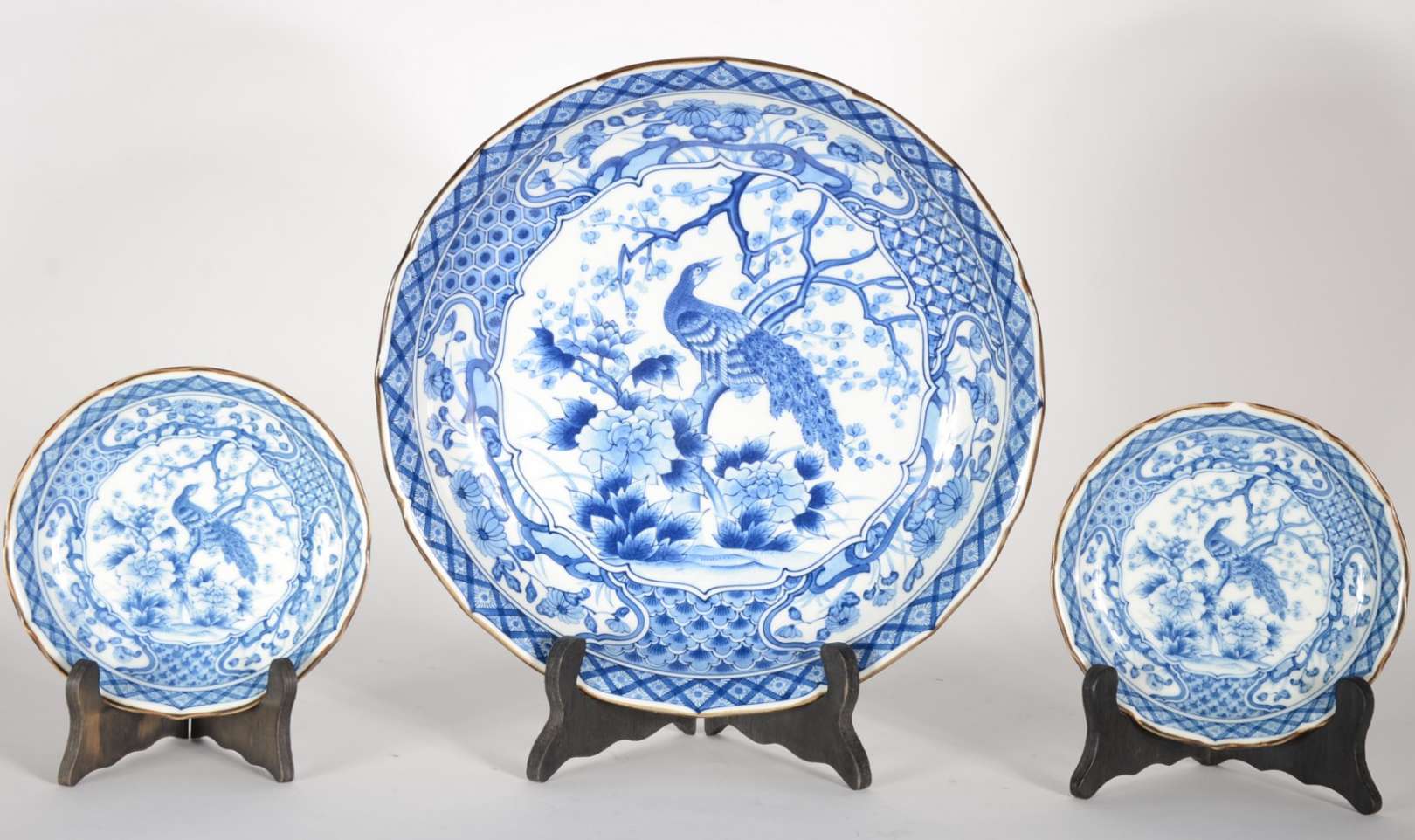 Conjunto de medalhão e par de pratos de porcelana japonesa azul e branca decoradas com aves do paraíso em tons de azul e branco. Um dos menores com pequeno bicado na borda.