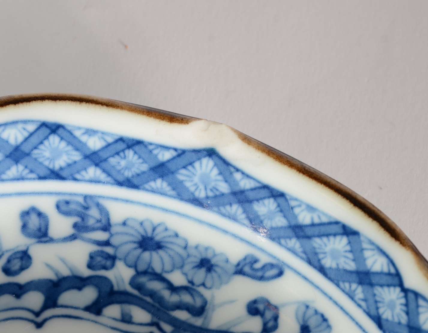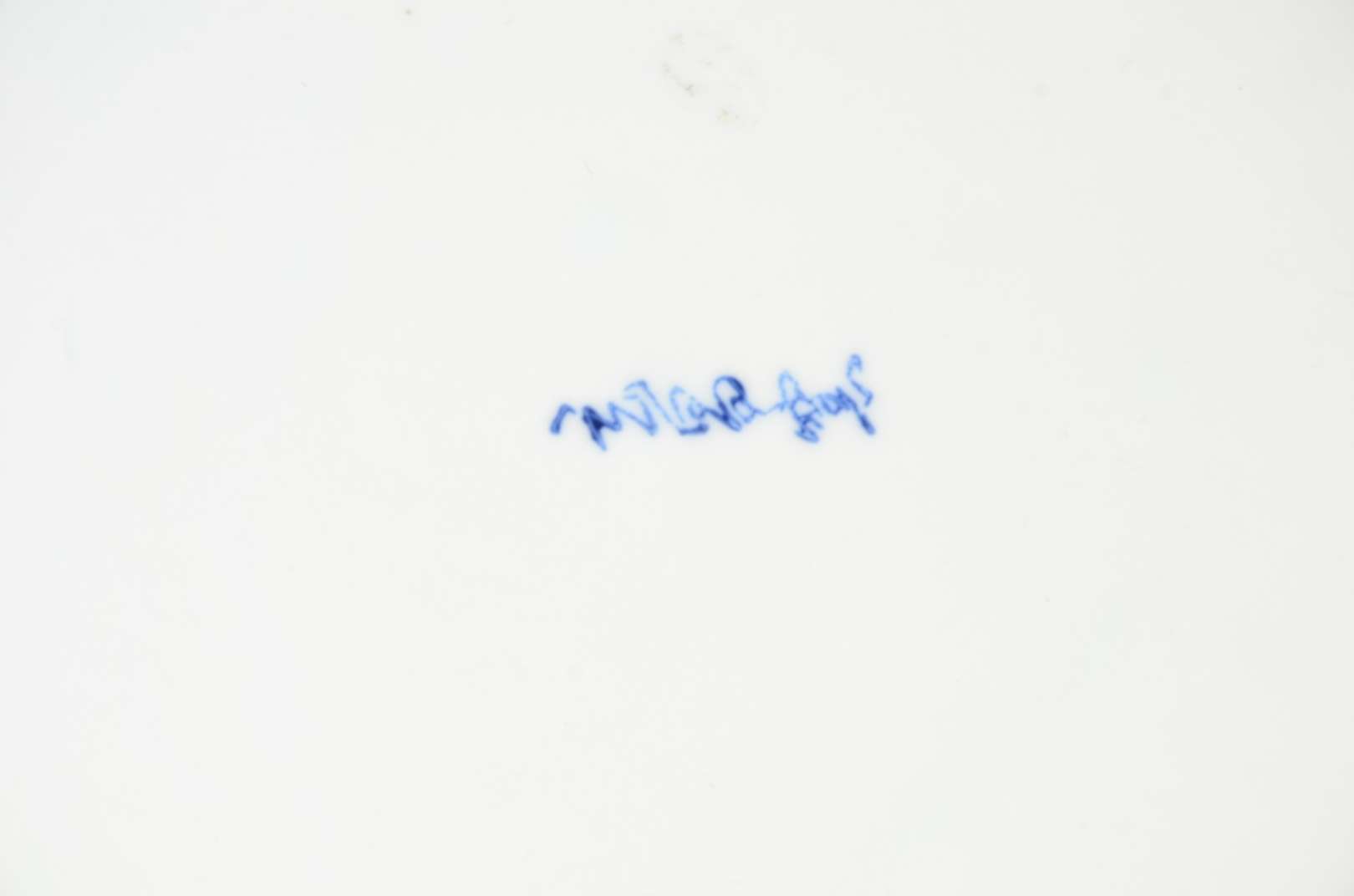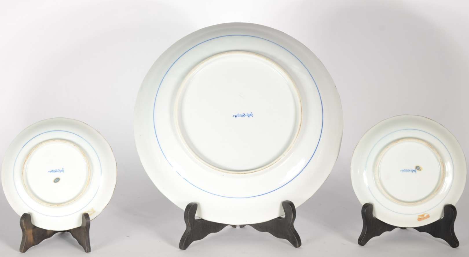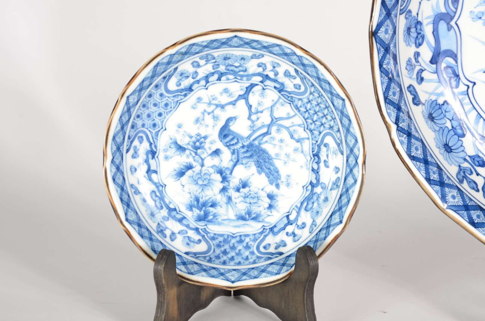 Conjunto de medalhão e par de pratos de porcelana japonesa azul e branca decoradas com aves do paraíso em tons de azul e branco. Um dos menores com pequeno bicado na borda.