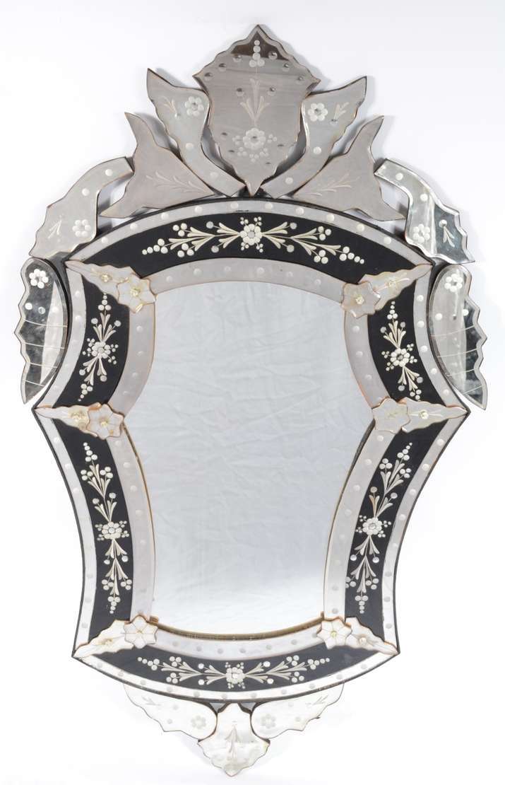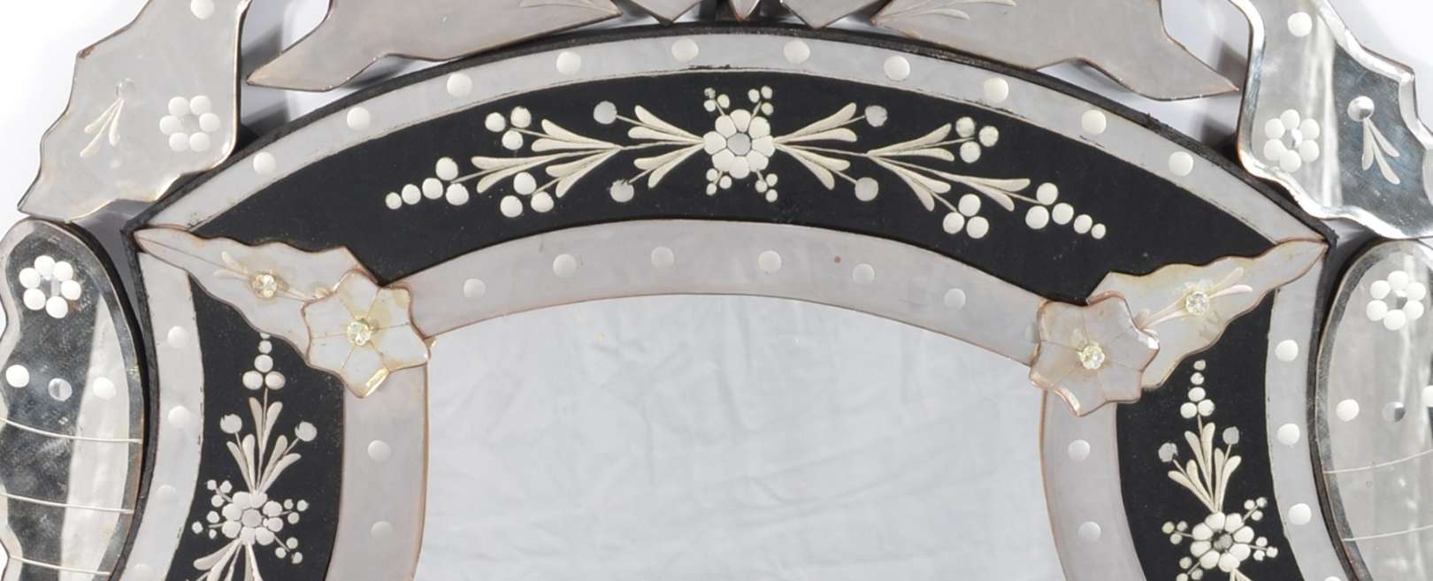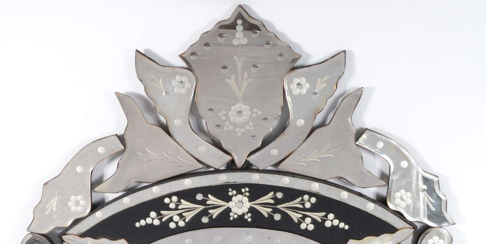 Espelho de cristal bisotado com moldura encimado pássaro entalhado. Asa quebrada.