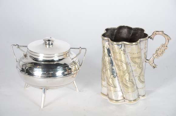 Duas peças, sendo: açucareiro com 3 pés e alça de prata de lei e, caneca de metal com detalhes cinzelados e gomos ret...