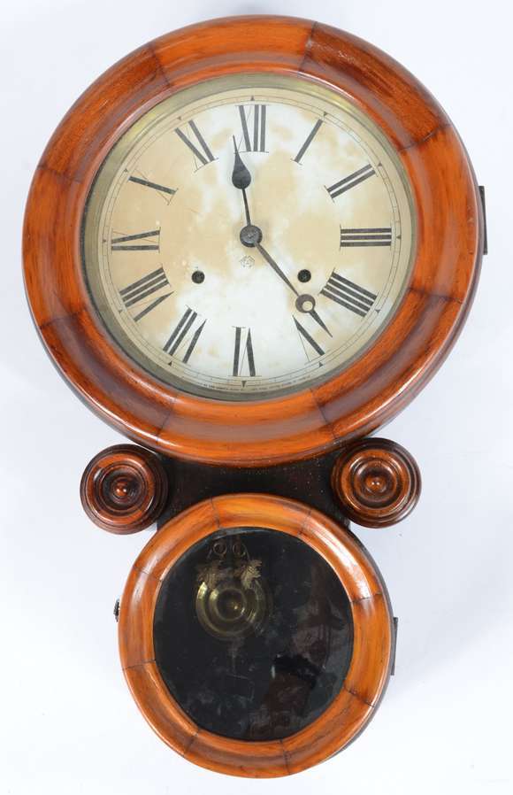 Relógio de parede com dois mostradores, um para as horas e outro para calendário, caixa de madeira. Desgastes. Precis...