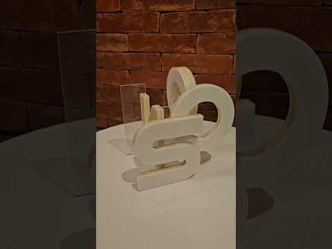 Escultura de resina na forma de chifre com animais em relevo, base de madeira.