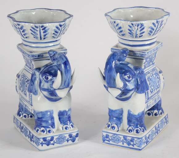 Par de esculturas de porcelana oriental azul e branca na forma de elefantes.