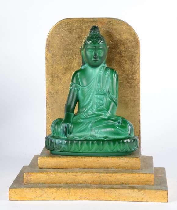 Figura de Buda de cristal na cor verde jade, trono de madeira dourada.