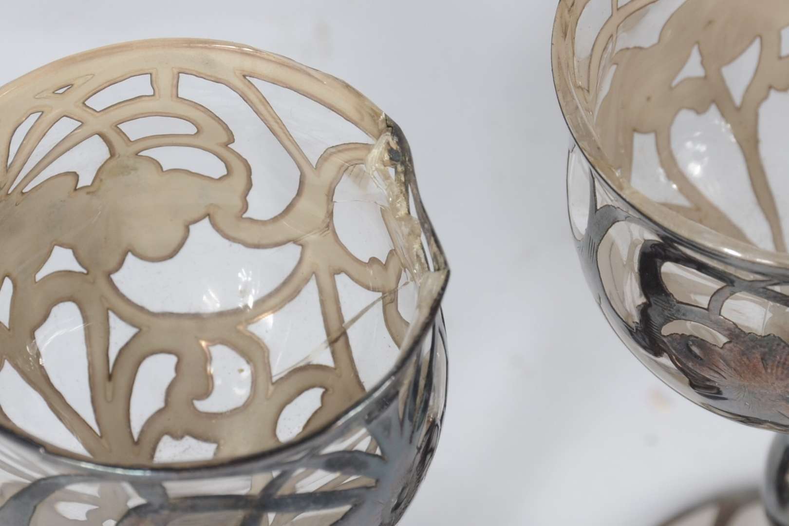 Garrafa de cristal europeu lapidado, gargalo de metal (pequenos amassados). Sem tampa.