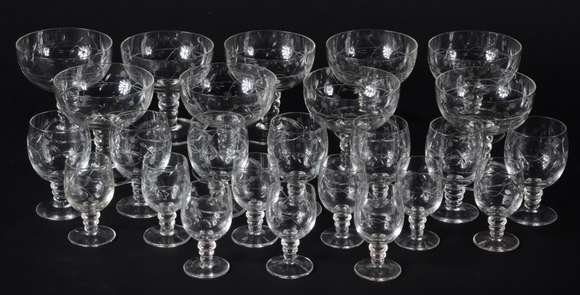 Conjunto em demi cristal lapidado, composto de: 9 taças para champagne, 7 para vinho do Porto e 9 para licor. Total: ...