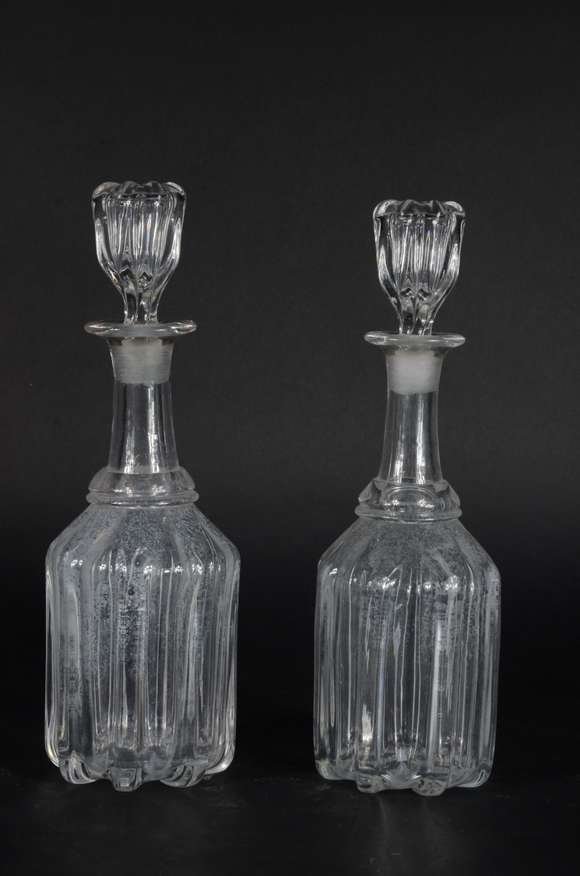 Par de garrafas de cristal lapidadas em gomos. Mofadas, tampas lascadas na parte interna. No estado.