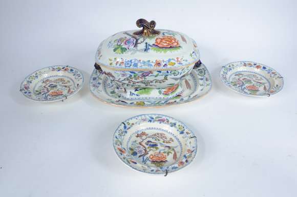 Sopeira de porcelana inglesa (rachada e tampa com rachadura e furo) com presentoir. Acompanham 3 pratos fundos.